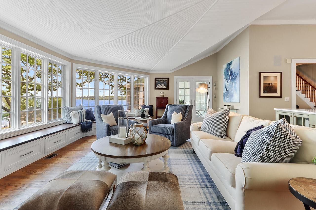 A bright, open-concept living room featuring expansive floor-to-ceiling windows that flood the space with natural light and offer serene lake views. A built-in window seat with storage below lines the wall, providing a cozy nook for reading or socializing. The soft, neutral palette, creams, light blues, and gentle grays, creates a soothing atmosphere accented by plush, patterned pillows and inviting armchairs. The layout encourages family gatherings with ample seating, including a spacious cream sofa and round coffee tables, ideal for games or snacks. Warm wood flooring and architectural ceiling details elevate the welcoming, family-friendly design.