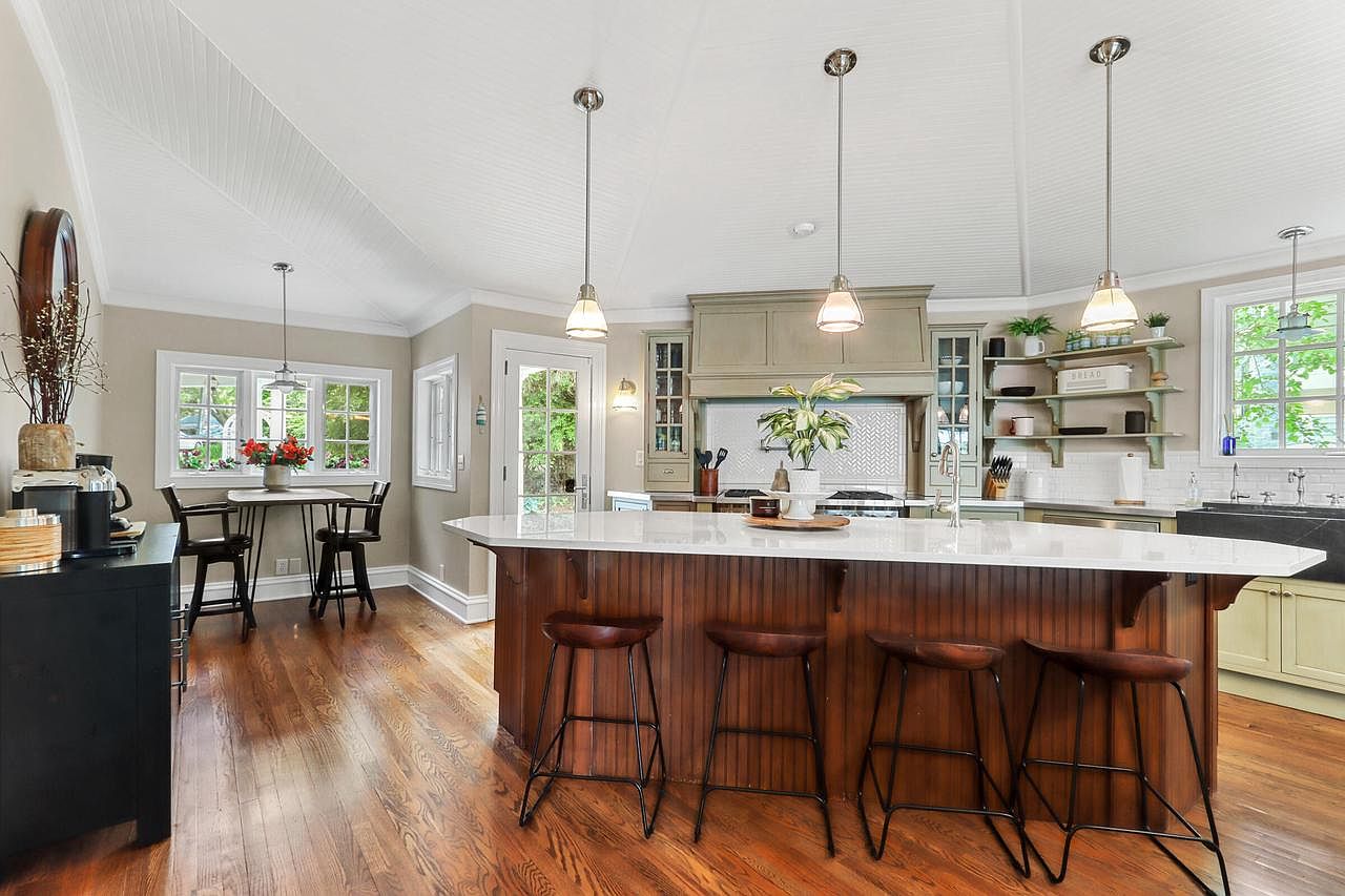 Warm hardwood floors lead into a spacious kitchen centered by a curved island with a gleaming white countertop, perfect for family gatherings or casual dining. The island is complemented by rich wood paneling and comfortable stools, while pendant lights above create a cozy atmosphere. To the side, a breakfast nook by large, sunlit windows provides an inviting spot for morning coffee. Muted sage cabinetry, open shelving, and farmhouse-style sinks add charm and practicality. Subtle beige walls and plentiful natural light foster an airy, welcoming feel, ideal for both everyday living and entertaining family and friends.