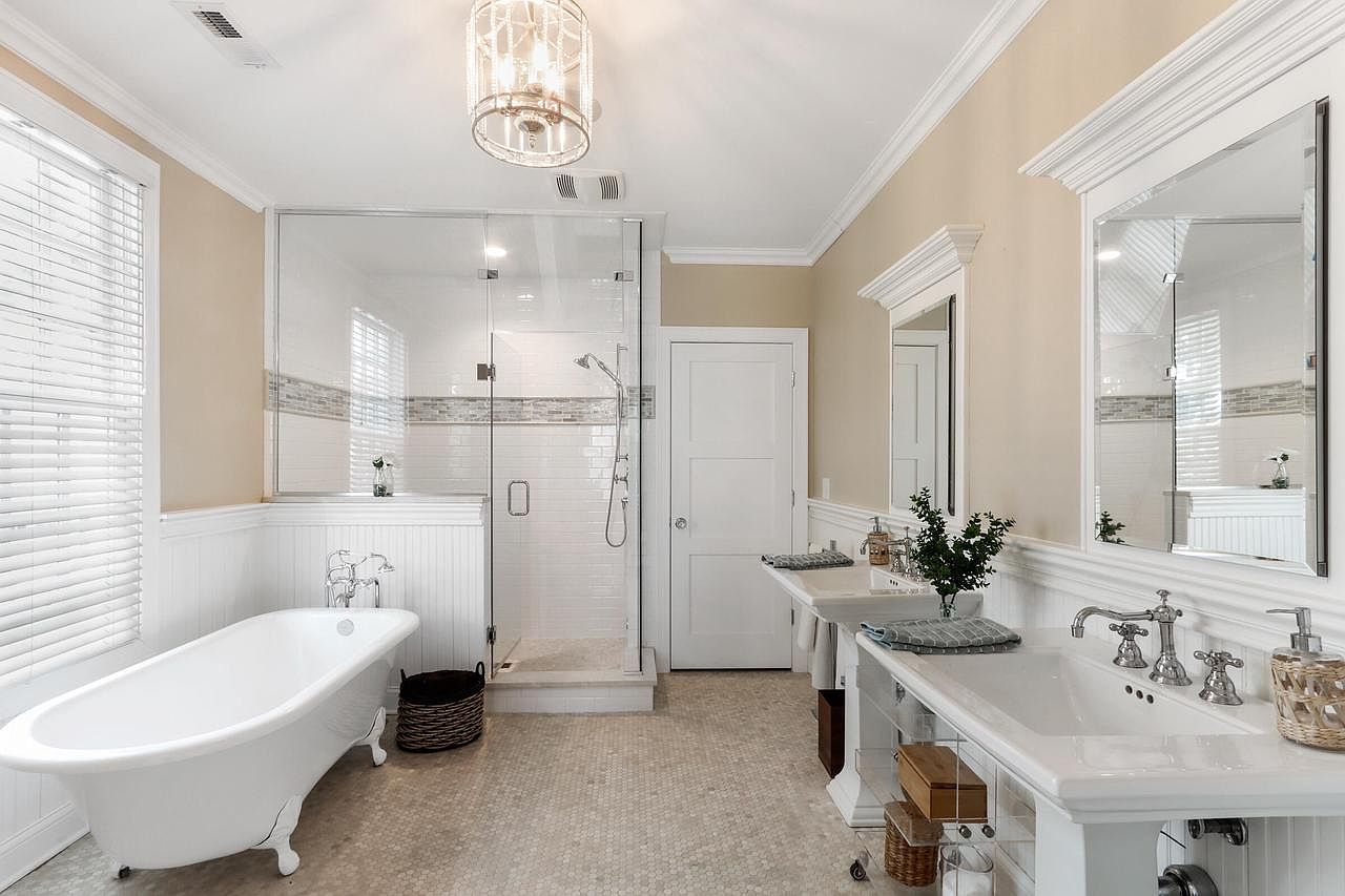 An inviting master bathroom blends classic charm and contemporary comfort. The freestanding clawfoot tub sits beside bright windows with white blinds, while a spacious glass-enclosed shower boasts modern tile accents. Twin pedestal sinks with chrome fixtures and detailed trim provide ample counter and storage space for busy families. The neutral palette of soft tan walls, white wainscoting, and timeless hexagon tile flooring enhances the room’s calm, airy atmosphere. Thoughtful touches such as mirrors with elegant moulding, a decorative light fixture, and greenery create a polished yet welcoming setting ideal for relaxation or accommodating the morning routines of a modern family.