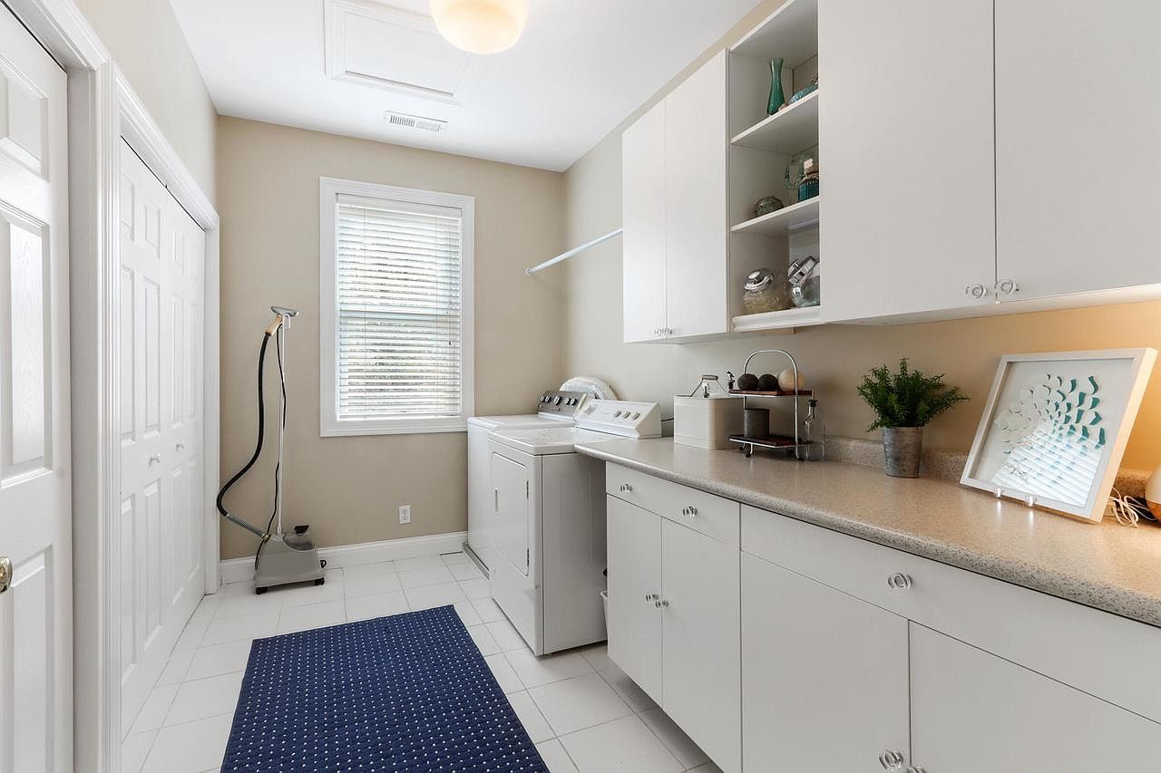 A bright and functional laundry room features ample built-in cabinetry and counter space, perfect for folding and organizing. The white cabinets with crystal knobs complement the neutral beige wall color and crisp white tile floor, creating a fresh and clean look. A washer and dryer set sits under a large window that allows plenty of natural light to pour in, making everyday chores more pleasant. Family-friendly elements include accessible storage, a sturdy countertop, and a clothing rod for air drying. Decorative touches like a framed print, potted plant, and subtle pops of color from shelf accents add warmth and visual interest.
