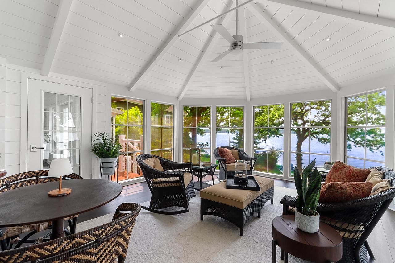 A spacious sunroom designed for relaxation and family gatherings, featuring abundant natural light from wraparound floor-to-ceiling windows that offer picturesque views of the surrounding greenery and water. The vaulted white ceiling with exposed beams and a modern ceiling fan adds open, airy elegance. Cozy wicker seating with plush cushions and a neutral area rug provide a welcoming, comfy atmosphere for both adults and children. A round dining table and leafy houseplants add to the inviting feel, while durable materials and smooth surfaces make the space perfect for children to play or families to unwind together.