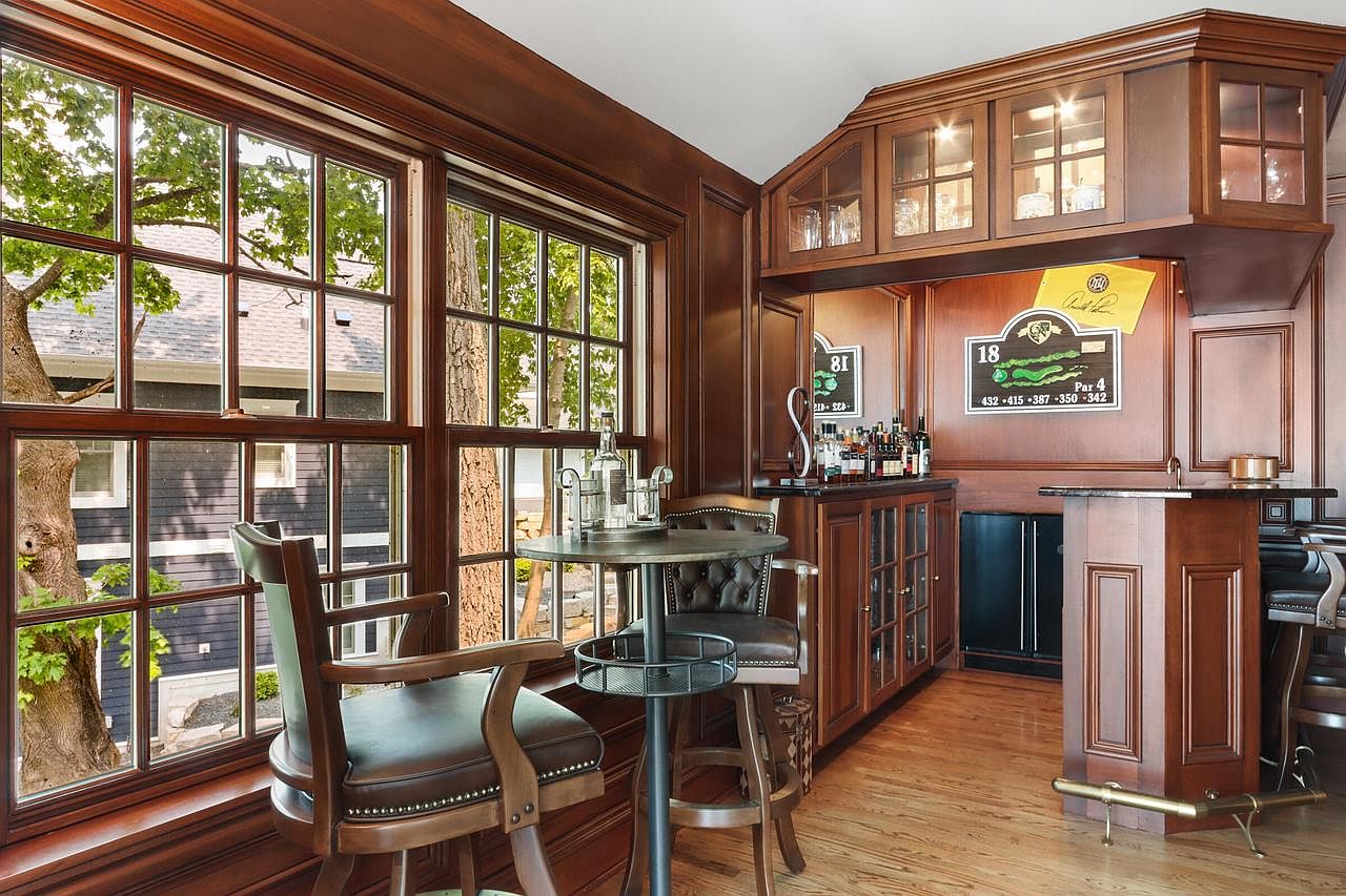 This elegant home bar is designed for both relaxation and entertaining, featuring rich wood paneling that creates a warm, inviting ambiance. Large picture windows frame lush outdoor views, flooding the room with natural light. The intimate seating area boasts cushioned, high-backed barstools and a small round table, ideal for family game nights or adult gatherings. Details like glass-front cabinets, granite countertops, and display shelving add sophistication, while a variety of drinks and bar tools are tastefully organized. The open layout encourages conversation and accessibility, making this a versatile space where everyone can enjoy a moment together.