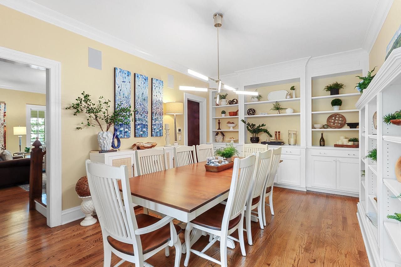 This spacious dining room strikes a perfect balance between elegance and comfort, ideal for family meals and entertaining guests. A warm, neutral palette is highlighted by soft yellow walls, crisp white trim, and built-in cabinetry with shelving that displays curated décor and greenery. The large wooden dining table surrounded by high-back chairs easily seats eight, making this space family-friendly for gatherings or celebrations. A modern chandelier brings a contemporary touch, while nature-inspired artwork and live plants add freshness. Ample natural light and open sightlines to the adjoining living area create a bright, inviting, and cohesive flow throughout the home.