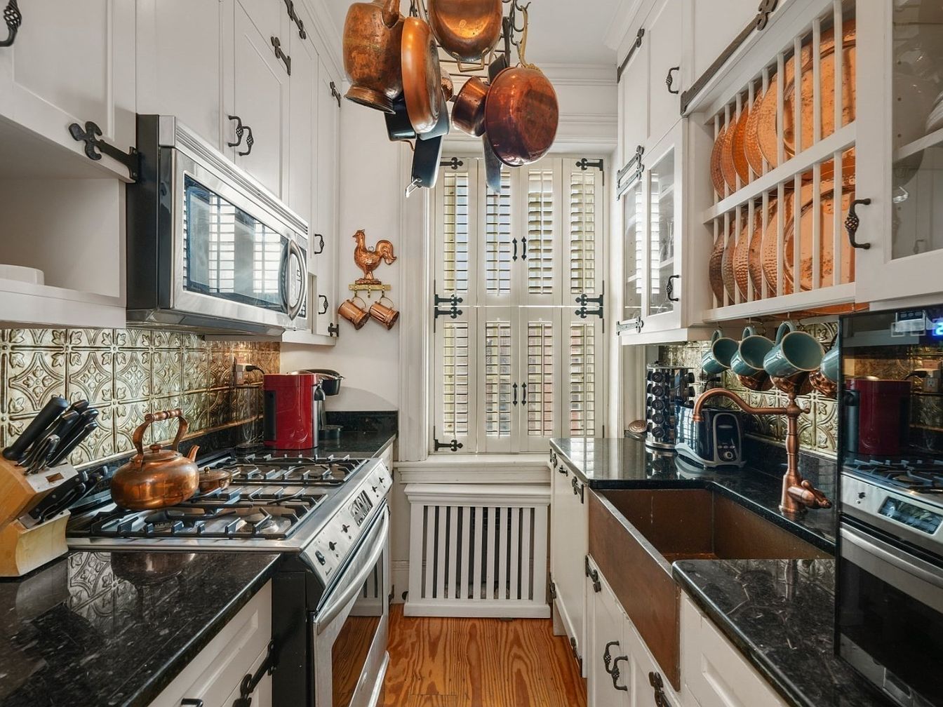 This charming galley kitchen features a cozy and efficient layout, perfect for busy family life. Crisp white cabinetry with black wrought-iron hardware provides ample storage, while the striking metallic tile backsplash and dark granite countertops add sophisticated contrast. Hanging copper pots and matching dishware infuse a warm, inviting touch, beautifully complementing the farmhouse sink and wooden floors. Natural light filters through elegant window shutters, enhancing the room’s airy ambiance. Family-friendly and practical, the space accommodates multiple appliances, coffee and tea stations, and accessible dish racks, creating a welcoming atmosphere for daily meals and gatherings.