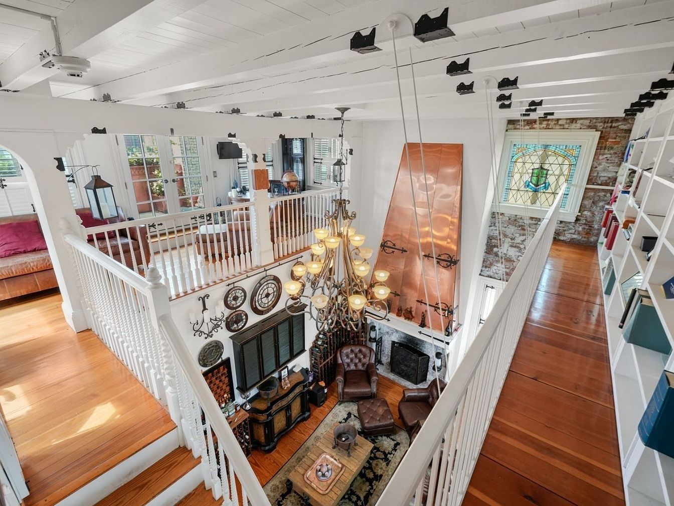 A sunlit loft-style living room features an open, multi-level layout with a double-height ceiling and elegant wood flooring. The space is anchored by a central seating area with rich leather armchairs and a wooden coffee table, surrounded by vintage accent pieces and a classic area rug. White railings and beams, paired with exposed brick and stained glass, blend historic charm with modern brightness. Family-friendly elements include a spacious walkway, accessible built-in bookshelves for a library nook, and cozy furniture that encourages gathering. Large windows and French doors allow plenty of natural light, creating a warm and welcoming atmosphere for all ages.
