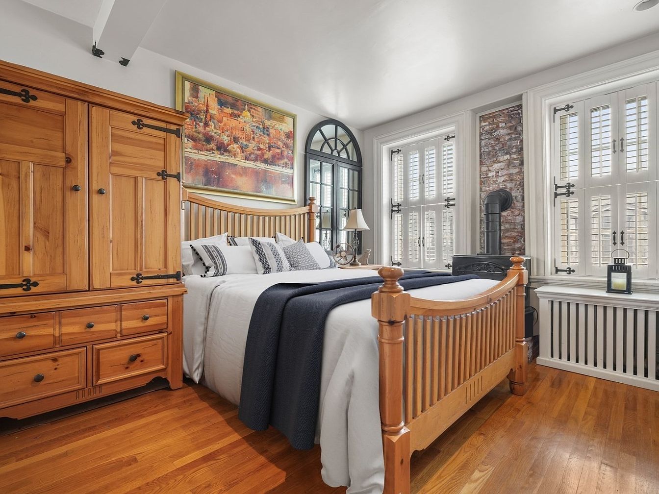 A cozy and inviting master bedroom pairs rustic charm with modern comforts, featuring warm wooden furniture that creates a welcoming atmosphere for families. The spacious layout is anchored by a beautiful wooden bed and large wardrobe, ideal for organizing family essentials. Natural light streams through classic white framed windows with plantation shutters, balancing privacy and brightness. A dramatic brick accent wall and black stove add a touch of historic character. Neutral bedding with navy throws and patterned pillows soften the space, while tasteful artwork above the headboard contributes a splash of vibrant color, making the bedroom both stylish and relaxing.
