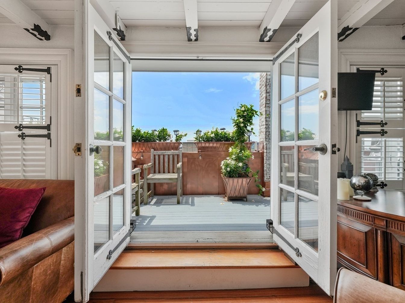 Bright, airy French doors open from a charming living area to a welcoming outdoor patio, blending indoor comfort with fresh outdoor appeal. The space is filled with natural light pouring through crisp white-framed glass doors, highlighting the exposed ceiling beams and white-painted walls for a timeless look. Potted greenery lines the patio’s railing, providing both privacy and a family-friendly natural touch. Classic wooden seating encourages relaxation and conversation, perfect for gatherings. Inside, a cozy leather sofa with a plush pillow and rich wooden furnishings add warmth and elegance, making the transition from indoors to outdoors seamless and inviting for all ages.