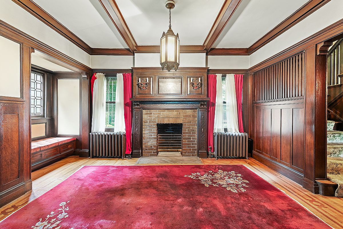 This charming living room features a beautifully crafted wood-paneled wall that exudes warmth and character. A grand fireplace, adorned with intricate brickwork, serves as the room’s focal point, complemented by elegant wooden accents and vintage sconce lighting. Large windows dressed with flowing white and red drapes allow natural light to flood the space, enhancing its inviting atmosphere. A cozy built-in window seat invites relaxation, while the plush area rug introduces a splash of color with floral motifs, harmonizing with the rich wood tones. This family-friendly layout encourages gatherings, making it an ideal setting for cozy evenings.