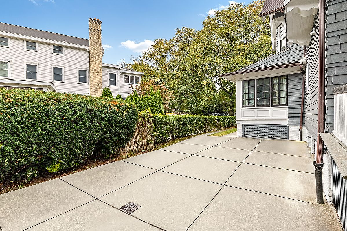 The inviting entrance features a spacious driveway, framed by neatly trimmed hedges and greenery, providing a warm welcome to family and guests. Architectural details highlight classic charm, with a combination of light and dark siding that showcases a timeless aesthetic. The cozy window nook invites natural light, while the stone chimney adds character and warmth. The surrounding landscape, populated with vibrant trees, enhances the home’s curb appeal, creating an ideal environment for outdoor gatherings. The combination of concrete and natural elements signifies a balance between functionality and beauty, making this a perfect family-friendly entrance.