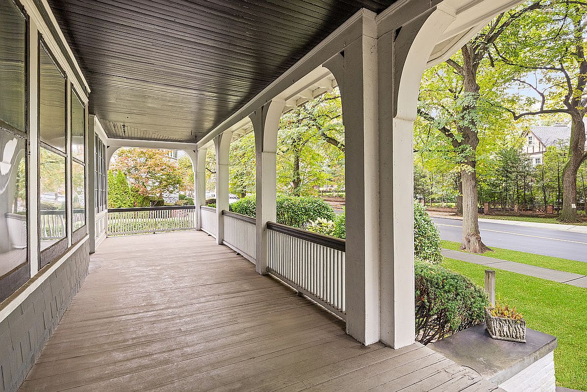 This spacious front porch invites relaxation with its charming design and natural surroundings. Featuring classic white railings and sturdy columns, the area is illuminated by soft, natural light filtering through large windows. The combination of the dark, painted ceiling and light wooden flooring creates an appealing contrast. Family-friendly elements, such as ample space for seating, make it perfect for gatherings and leisure activities. Lush greenery and well-maintained gardens enhance the overall aesthetic, fostering a welcoming atmosphere. Ideal for sipping morning coffee or sharing stories in the evening, this porch embodies the essence of community and togetherness.