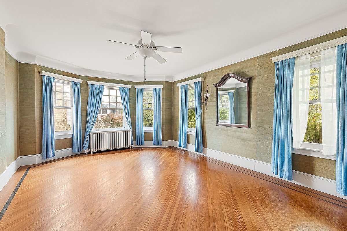 This airy sitting room showcases large bay windows framed with elegant blue curtains, allowing ample natural light to flood the space. The subtle green wallpaper complements the polished hardwood floors, enhancing the room’s warmth and inviting atmosphere. Architectural details include a vintage mirror and a stylish wall sconce, which add character and charm. A modern ceiling fan provides comfort while maintaining a classic feel. The layout is perfect for family gatherings or quiet relaxation, making this room an ideal retreat. Its sophisticated yet cozy design blends timeless elegance with everyday functionality.