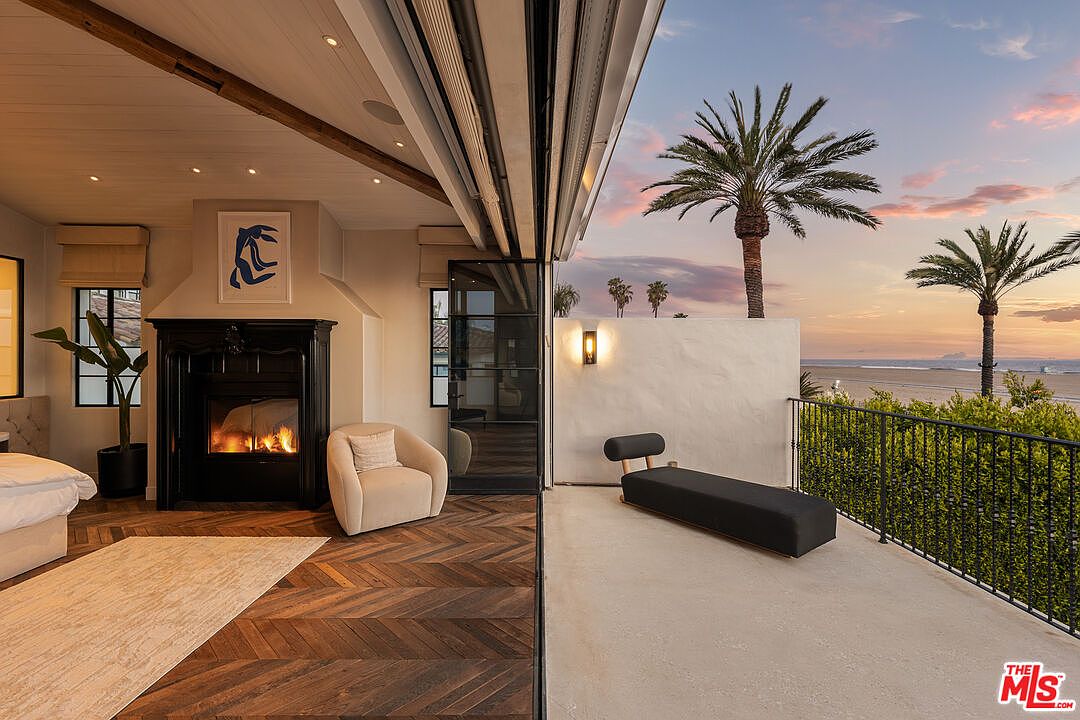 A serene primary bedroom merges seamlessly with the outdoors through fully retractable glass doors, offering panoramic ocean views and inviting abundant natural light. The herringbone wood floors and exposed wood beams bring warmth and rustic elegance, while neutral tones in bedding and upholstery create a calming atmosphere. The inviting fireplace provides comfort and a charming focal point for family relaxation. Plush seating areas by the window and outside on the terrace cater to both intimate moments and family lounging. Pops of greenery add freshness, while modern art and subtle architectural details elevate the sense of sophisticated coastal living.