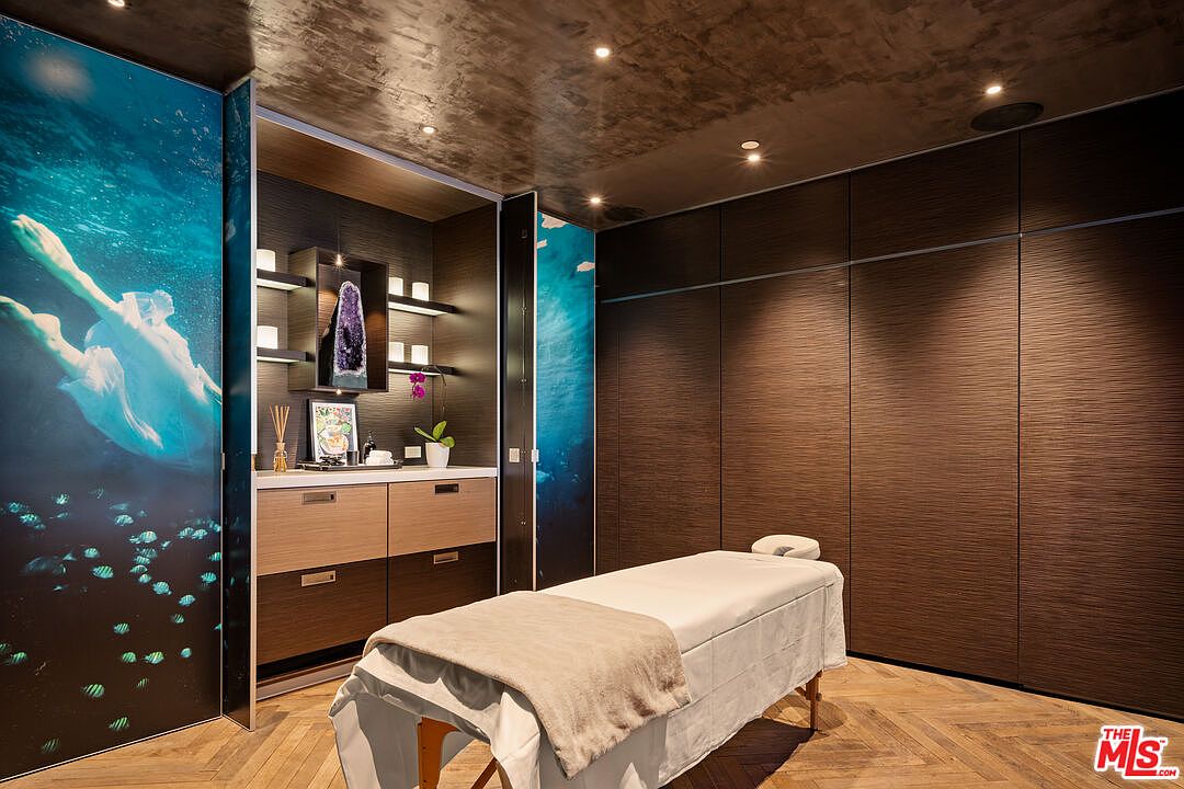 A tranquil spa retreat designed for relaxation and wellness, featuring a massage table centrally placed on a herringbone wooden floor. The space is enveloped in rich, dark wood paneling and illuminated by soft, recessed lighting, creating a soothing ambiance. Striking underwater-themed wall art adds a touch of creativity and serenity, making the space visually captivating and inviting. The built-in vanity area offers open shelving with calming decor and essential oils, perfect for family members seeking private moments of self-care or massage therapy. The overall palette of earthy browns and aquatic blues fosters a peaceful, family-friendly sanctuary.