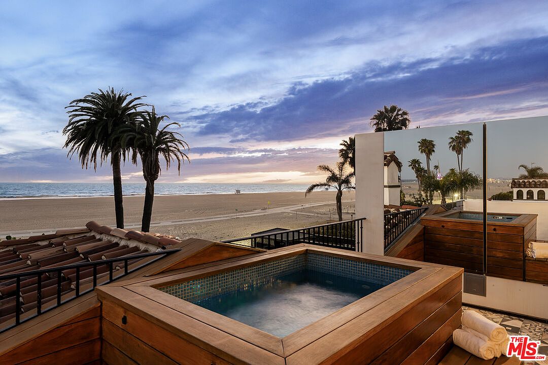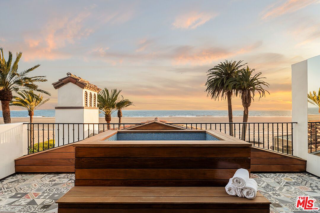 A stunning rooftop oasis features a sleek wooden hot tub as its centerpiece, perfect for relaxing while enjoying breathtaking ocean views. The space is bordered by a wrought-iron railing that ensures safety for families, and the patterned tile flooring adds a playful, artistic touch. Framed by swaying palm trees and a backdrop of the shimmering beach, the area exudes a resort-like ambiance. The warm wood finishes complement the breezy, coastal aesthetic, while carefully placed towels offer convenience for all ages. This retreat is ideal for family gatherings, sunset watching, or simply unwinding in privacy above the shoreline.