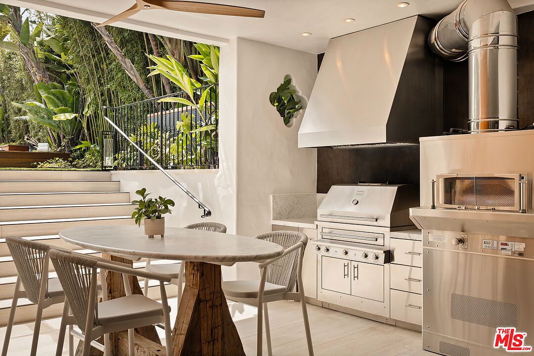 This inviting outdoor kitchen and dining area blends seamlessly with lush garden views, making it ideal for family gatherings and entertaining. The space features a modern stainless steel grill and pizza oven set against clean white walls, enhanced by recessed lighting. A chic oval marble dining table with rustic wooden accents is surrounded by comfortable woven chairs, offering ample seating for children and adults alike. Light-toned flooring leads to a short staircase, connecting the kitchen to a verdant garden. The neutral palette, natural textures, and indoor-outdoor flow create a warm, family-friendly space perfect for al fresco meals.