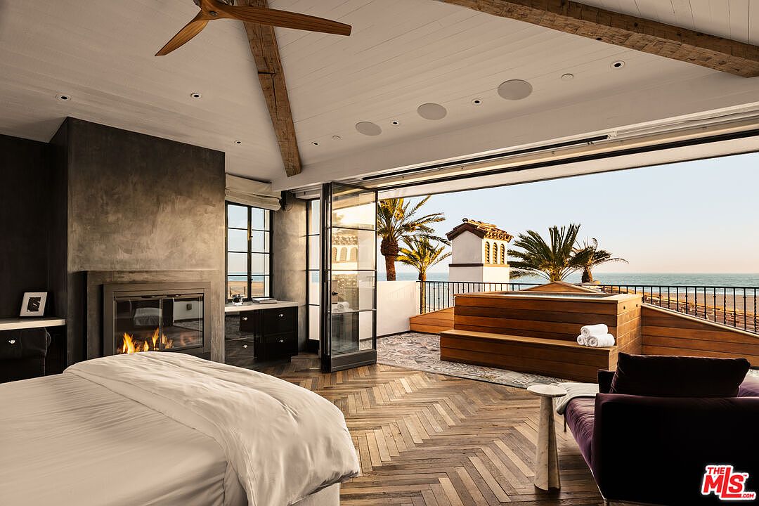 This luxurious bedroom offers an inviting retreat with panoramic sliding doors that seamlessly open out to a spacious terrace overlooking the ocean. The calming neutral palette is accented by natural wood, seen in the chevron-patterned floors and exposed beam ceiling. A modern fireplace provides warmth and a cozy ambiance, while the plush bed is perfect for relaxing. Family-friendly features include open, unobstructed sightlines and ample space for gathering. Outside, a wooden hot tub and lounge area promise endless enjoyment with a backdrop of palm trees and the sea, creating a true blend of indoor comfort and outdoor leisure.