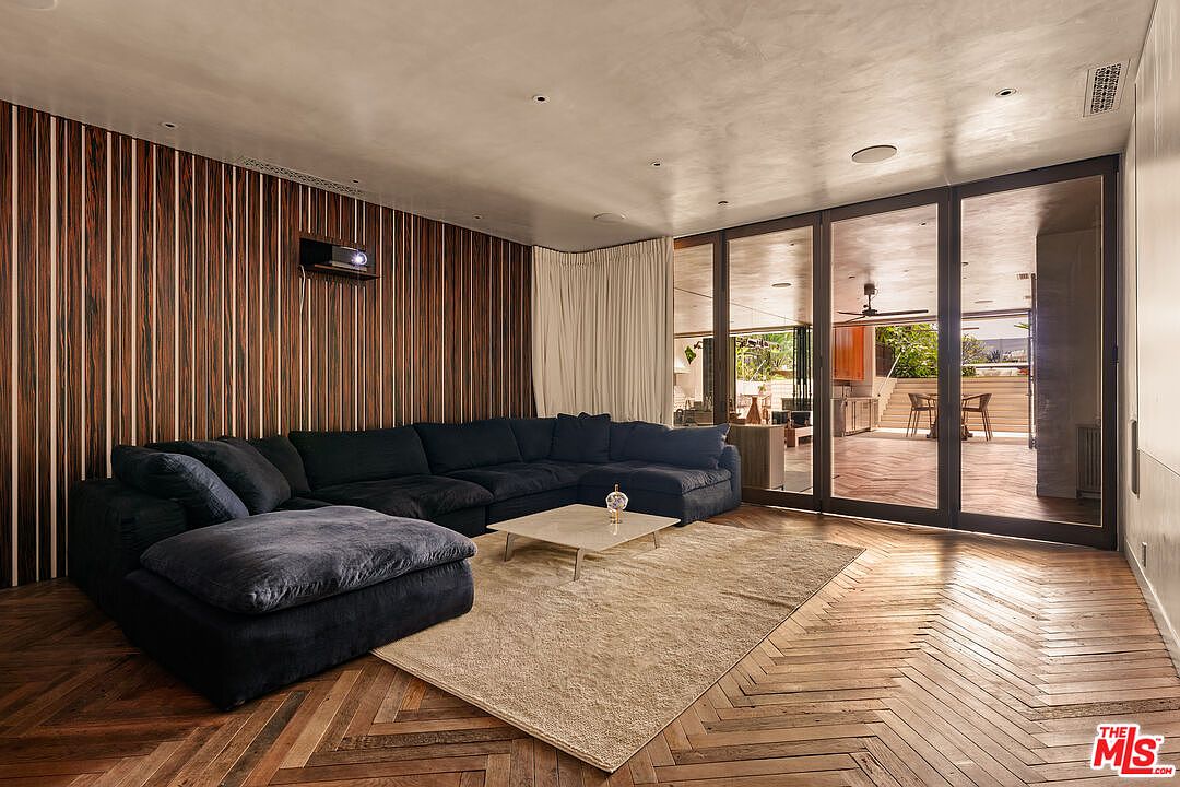 A warm, spacious family lounge features a large sectional sofa in deep navy, perfect for gatherings and relaxation. The space boasts a contemporary design with a stunning wood-paneled accent wall adding texture and depth. Elegant chevron-patterned wooden floors pair seamlessly with a soft, neutral area rug and a minimalist coffee table. Massive floor-to-ceiling glass doors allow abundant natural light and connect the room with an inviting patio, promoting indoor-outdoor living. The cozy layout is ideal for children and adults alike, while the mounted projector hints at family movie nights. Subtle lighting and soft drapery create a comfortable, intimate ambiance.