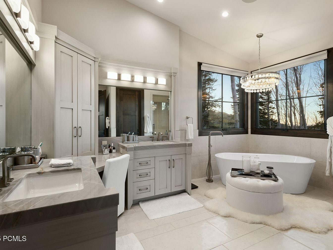 An inviting master bathroom designed for relaxation and comfort, featuring a freestanding soaking tub set by large corner windows with tranquil outdoor views. The neutral color palette of soft grays and whites creates a calm, airy ambiance, enhanced by stone countertops and custom cabinetry. Family-friendly touches include dual sinks, a plush white rug, and an upholstered ottoman for added seating or towel storage. Elegant details like the modern chandelier, ample lighting, and spacious vanity area make the space ideal for busy family routines or quiet personal moments. Carefully chosen fixtures and clean architectural lines contribute to a sophisticated, welcoming atmosphere.