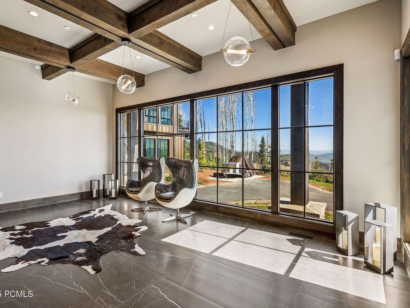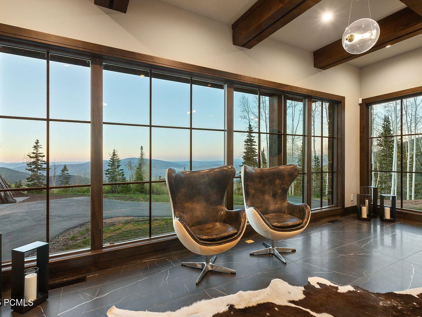 Expansive floor-to-ceiling windows frame breathtaking mountain vistas, filling this bright sitting area with natural light. The room features dramatic wood ceiling beams that add rustic warmth and architectural interest, contrasting beautifully with the contemporary marble-look tile floor. Two modern, swivel accent chairs upholstered in sleek leather invite relaxed conversation or quiet contemplation, while a statement cowhide rug brings texture and visual intrigue. Large lanterns with candles in minimalist holders line the corners, promoting a family-friendly ambiance. The open layout and ample space make this area perfect for unwinding, with a seamless indoor-outdoor flow ideal for modern family living.