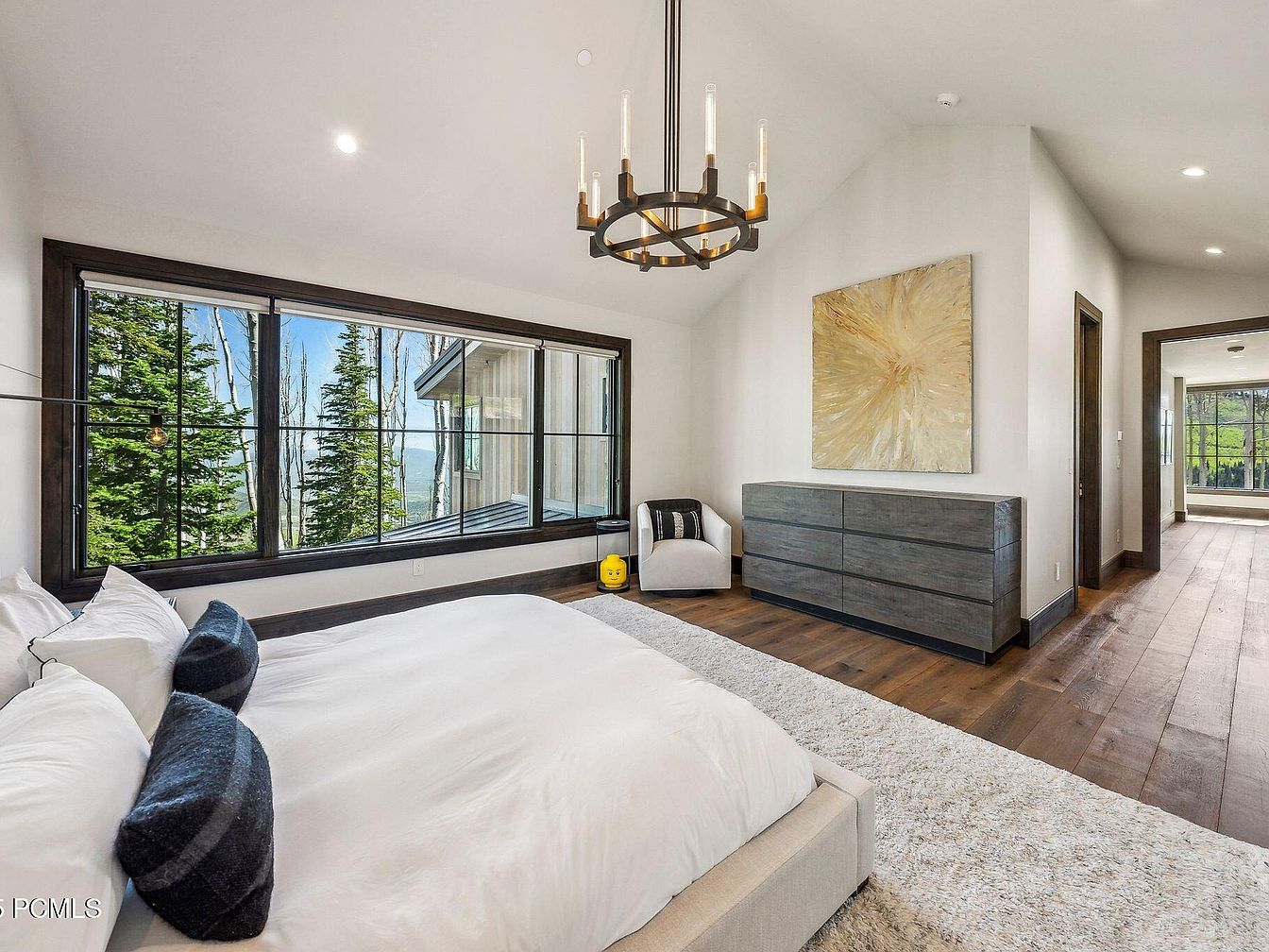 Spacious and serene, this master bedroom features a modern yet cozy design with a neutral palette of whites, grays, and natural wood tones. Large windows frame scenic forest views, filling the room with natural light and creating a tranquil atmosphere perfect for relaxation. The plush white area rug adds warmth and comfort underfoot, while the upholstered bed is layered with crisp linens and accent pillows. Sleek wall-mounted sconces provide convenient reading light, complemented by a statement chandelier overhead. Family-friendly touches include ample floor space and easy-to-clean finishes, making the room both stylish and practical for everyday living.