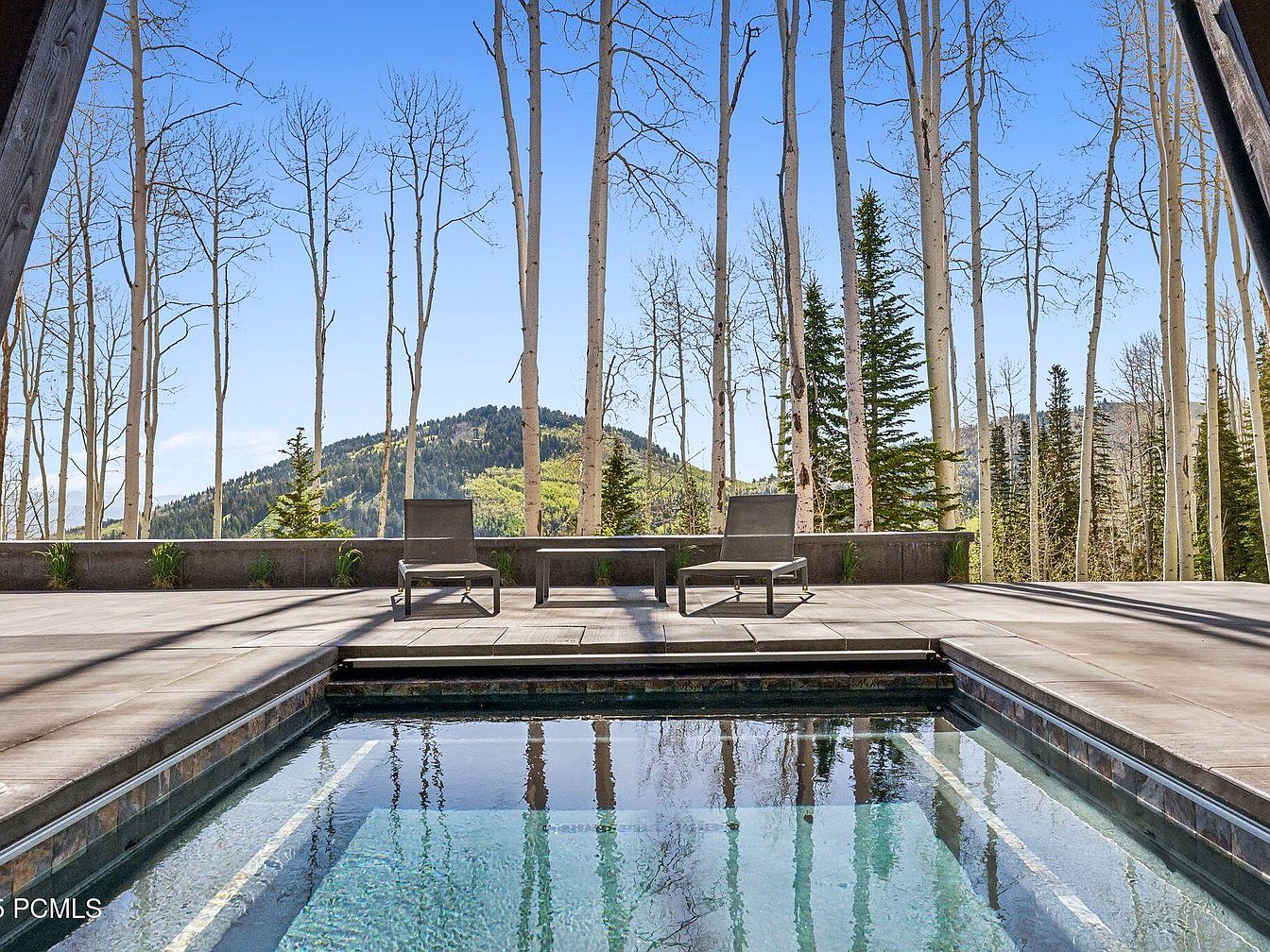 A serene outdoor pool area framed by tall, slender trees creates a tranquil oasis perfect for family relaxation and gatherings. The expansive stone patio offers plenty of space for kids to play safely while parents unwind on modern lounge chairs shaded by nature. The contemporary design showcases clean lines and a minimalistic approach, allowing the breathtaking mountain views to take center stage. Subtle planters add touches of green, while the shimmering water beautifully reflects the surrounding landscape. The seamless transition between the outdoor living space and natural beauty makes it ideal for enjoying summer days together in comfort and style.