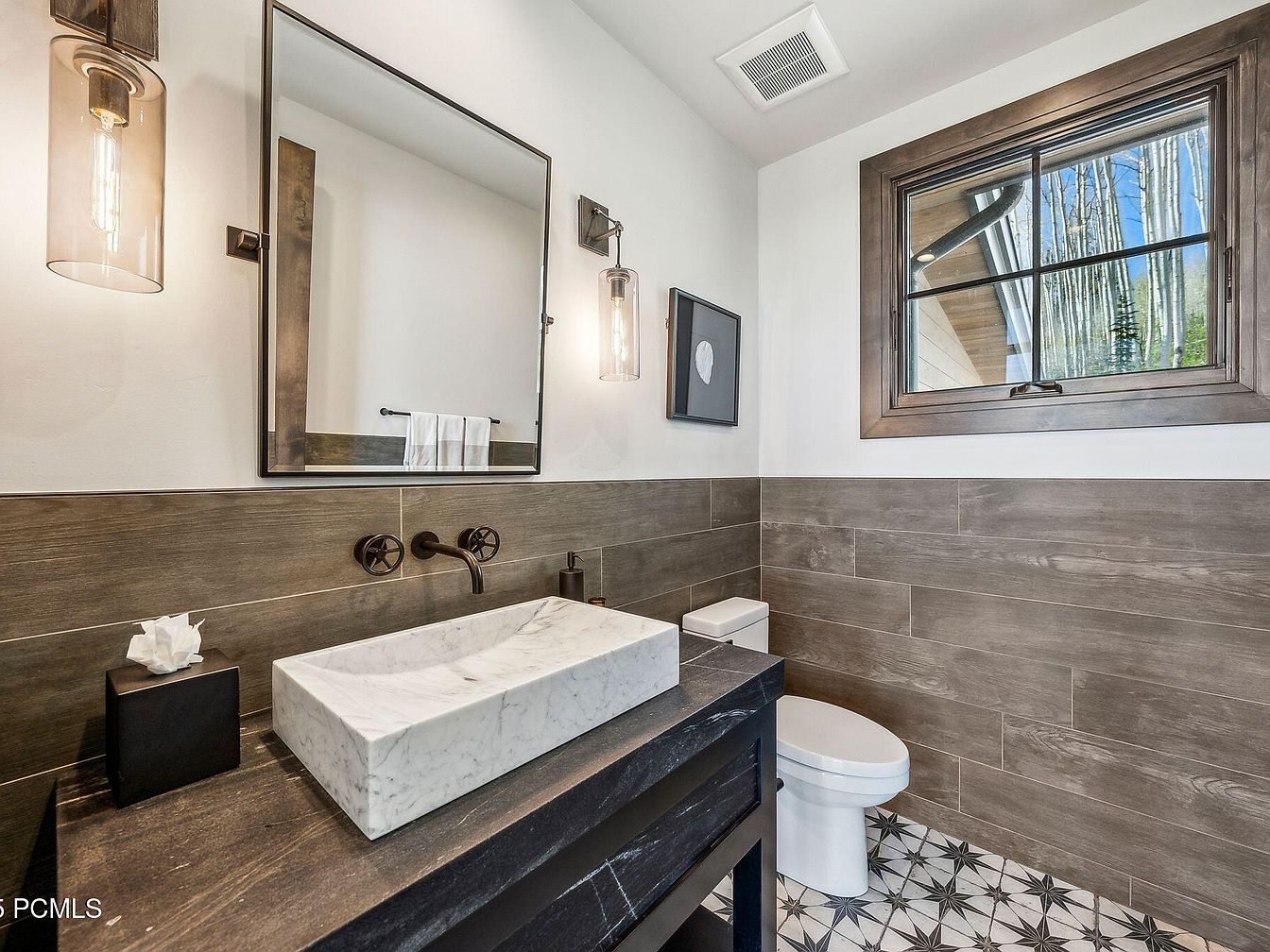 A striking blend of modern and rustic elements, this bathroom vanity area features a wide marble sink set atop a dark wood counter. Contemporary wall-mounted bronze fixtures add a touch of industrial charm, complemented by geometric pendant lights framing a sharp-edged mirror. Warm, wood-look tiles wrap around the lower half of the walls, adding coziness and visual interest, while patterned tile flooring brings subtle energy to the space. A large window bathes the room in natural light and offers a view of nature, fostering a family-friendly atmosphere that feels fresh, clean, and connected to the outdoors.