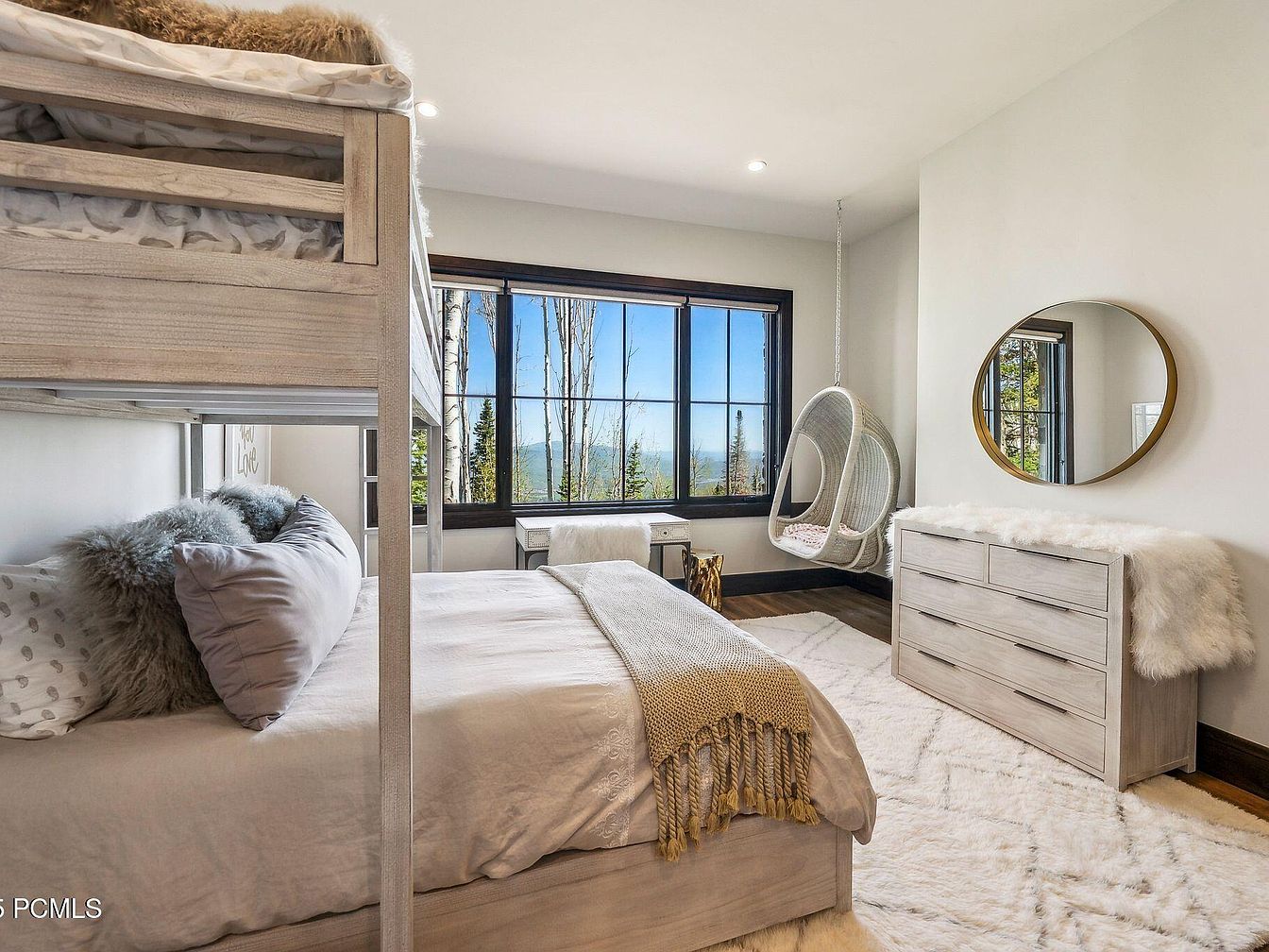 A bright and spacious kids’ bedroom features a cozy bunk bed in weathered wood tones complemented by soft, neutral bedding and textured throws, inviting restful sleep and relaxation. A fluffy white area rug covers much of the floor, creating a soft play area, while a stylish dresser topped with faux fur provides ample storage. A unique hanging chair in one corner encourages reading and daydreams, making this space perfect for both play and rest. Large windows fill the room with natural light and frame the inviting outdoor views, bringing a sense of calm and connection to nature inside.