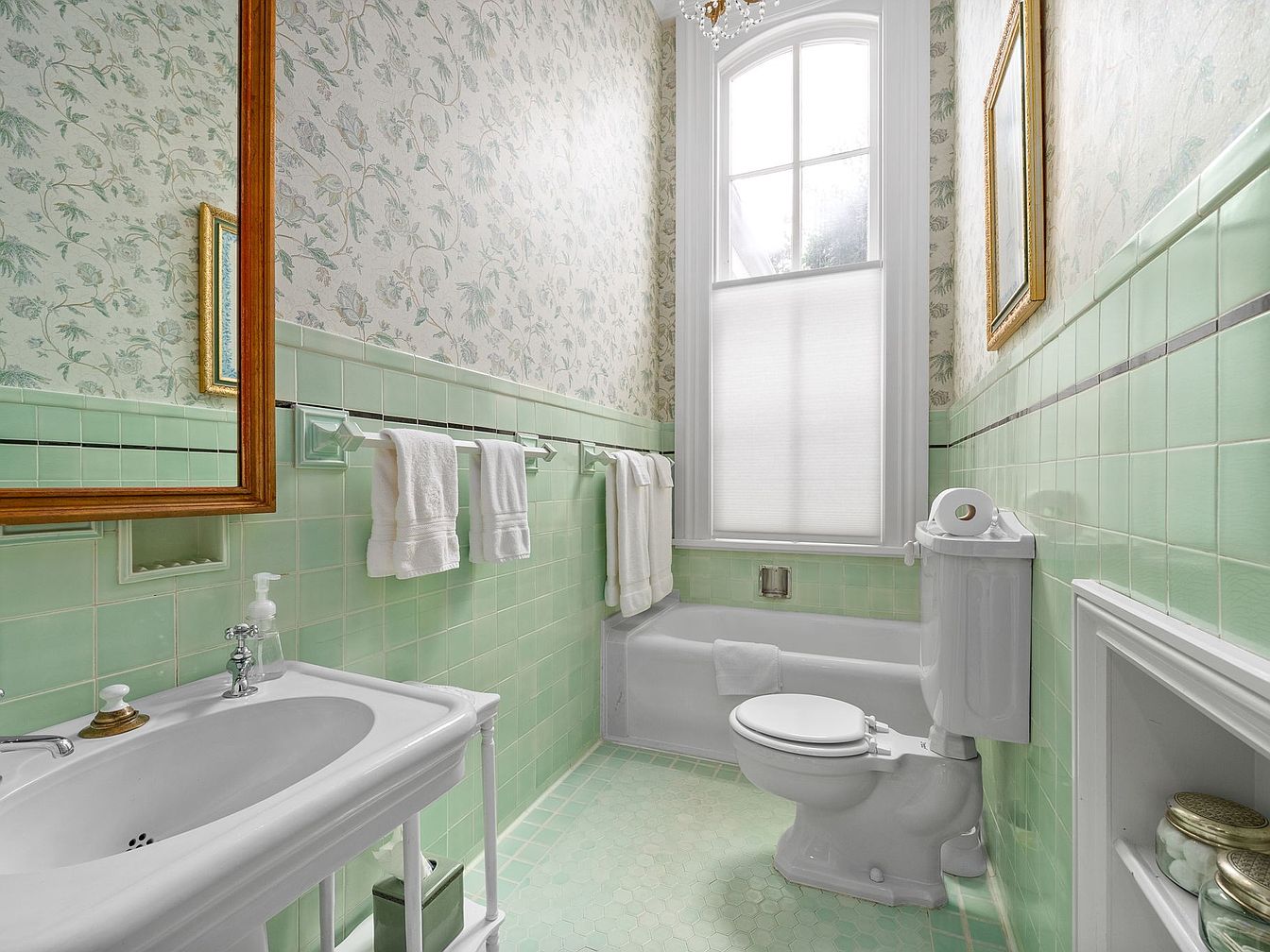 Soothing mint green tiles line the walls and floor, creating a fresh and calming atmosphere in this classic family bathroom. The room features a white porcelain pedestal sink, a bathtub with a built-in shower, and a traditional-style toilet. Delicate floral patterned wallpaper above the tiles adds a touch of vintage elegance and charm. Natural light streams through a tall, arched window with a sheer shade for privacy. Practical features include a wall-mounted towel rack, built-in shelving for storage, and accessible accessories, making this space both stylish and functional for family members of all ages.