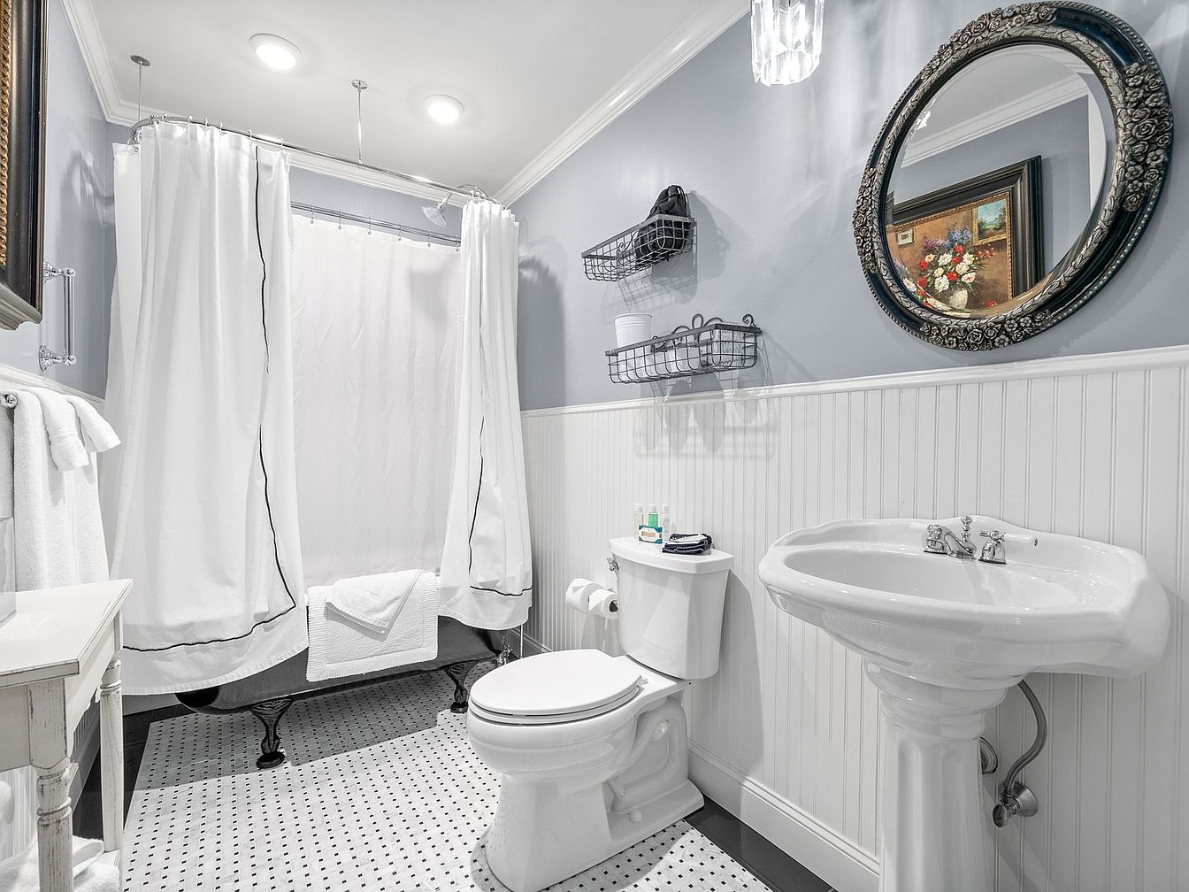 This charming bathroom features a classic clawfoot tub with a white shower curtain, ideal for families with children thanks to its deep soaking design and safety. The pale blue walls are paired with crisp white wainscoting, creating a calming and timeless atmosphere. Elegant details like a pedestal sink, vintage-style mirror, and black metal storage baskets add practical storage while maintaining the room’s inviting look. Bright recessed lighting and a statement pendant make the space feel open and airy. White and black mosaic tile flooring enhances durability and style, making this bathroom both functional and visually appealing for any household.
