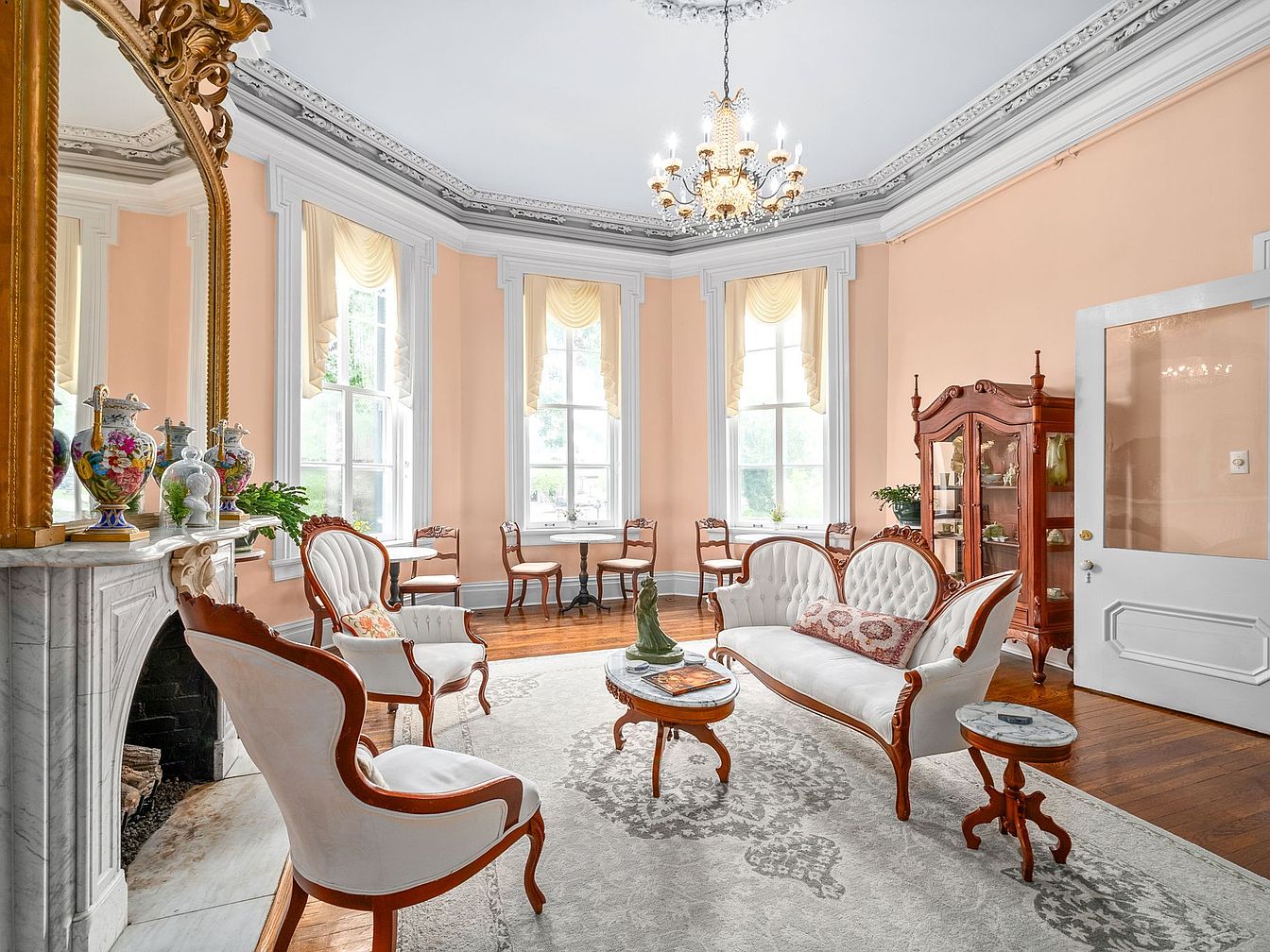 Step into a sun-filled living room featuring elegant Victorian touches and family-friendly layout. Soft peach walls are crowned by ornate white ceiling moldings, drawing your eye upwards to a grand chandelier. Five tall windows draped with delicate cream curtains soak the space in natural light, creating an inviting atmosphere. The focal point marble fireplace sits beneath a resplendent gold-framed mirror. Classic, tufted furniture in white upholstery gracefully complements the warm wood floors, while a light patterned rug grounds the seating area. An antique display cabinet and dainty tables provide practical surfaces for family activities and decorative heirlooms.