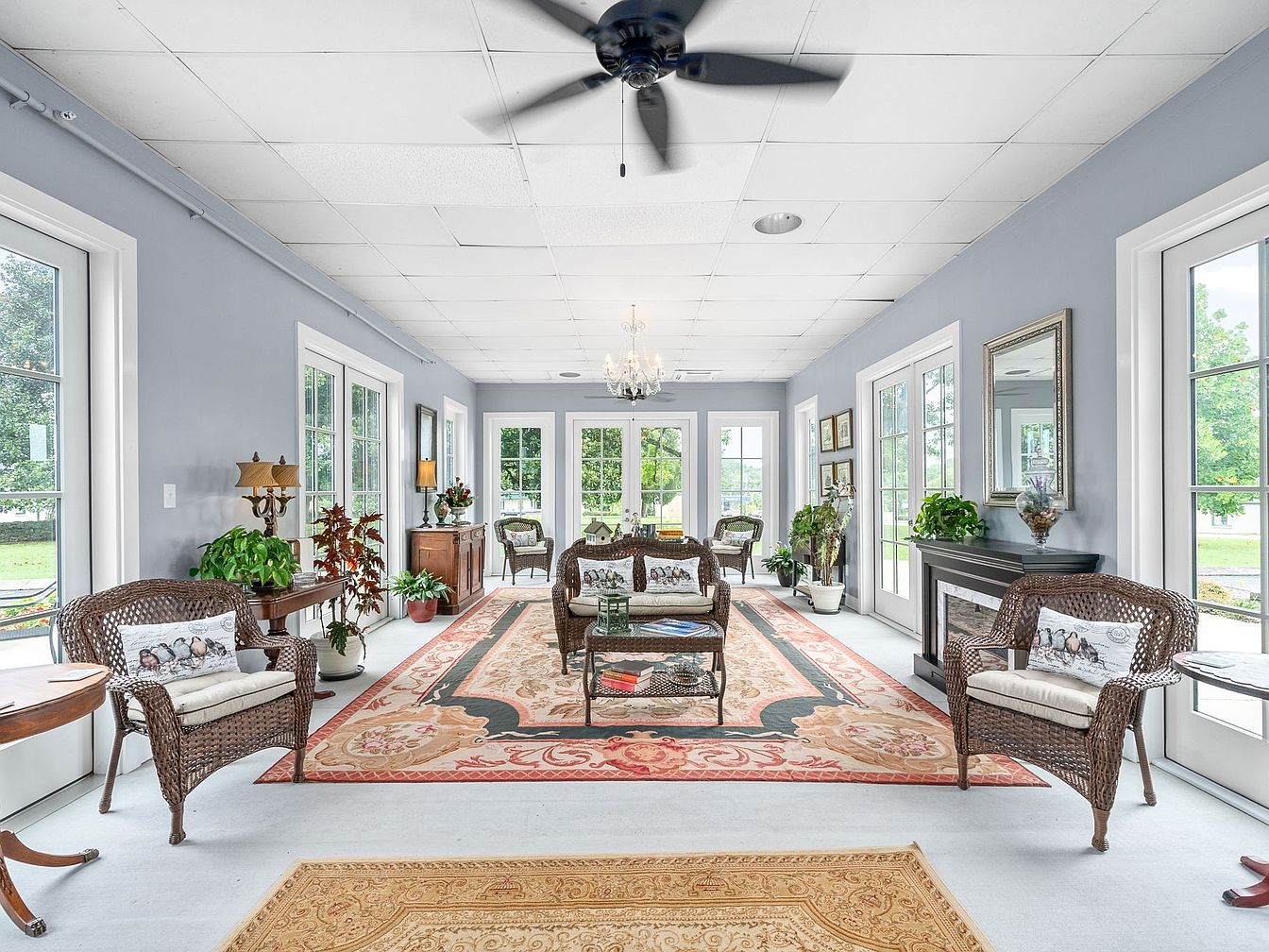 Expansive sunroom with walls of tall windows bathing the space in natural light, perfect for gatherings and family relaxation. The room is elegantly arranged with comfortable wicker seating and patterned cushions, plus a large decorative area rug that adds color and warmth. Soft blue-gray walls enhance the serene atmosphere, while indoor plants bring life and freshness. Classic touches, like the chandelier and antique-style side tables, blend with modern elements such as the ceiling fan and clean-lined mirror. The spacious layout, ample seating, and durable materials make this a welcoming, kid-friendly retreat for reading, games, or simply enjoying the outdoors from indoors.
