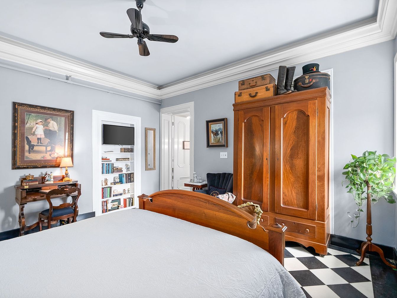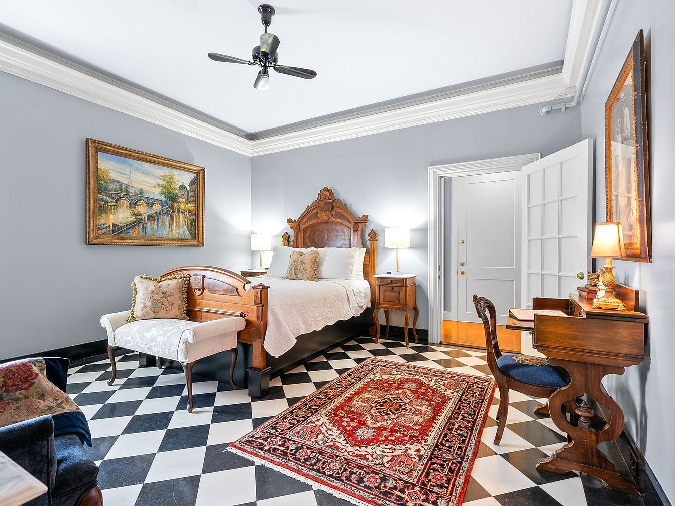 A spacious bedroom blends classic elegance with modern comfort, featuring a striking black-and-white checkered tile floor and light gray walls accented by crisp white crown molding. The room centers around a grand wooden bed with intricate carvings, flanked by matching nightstands and soft lighting, while a plush upholstered bench provides a cozy family seating area. The workspace is thoughtfully arranged with an antique writing desk and chair, ideal for reading or study. Rich textiles, from a traditional patterned rug to embroidered throw pillows, enhance warmth. Framed artwork and tasteful decor create an inviting, multi-functional retreat suitable for both rest and productivity.