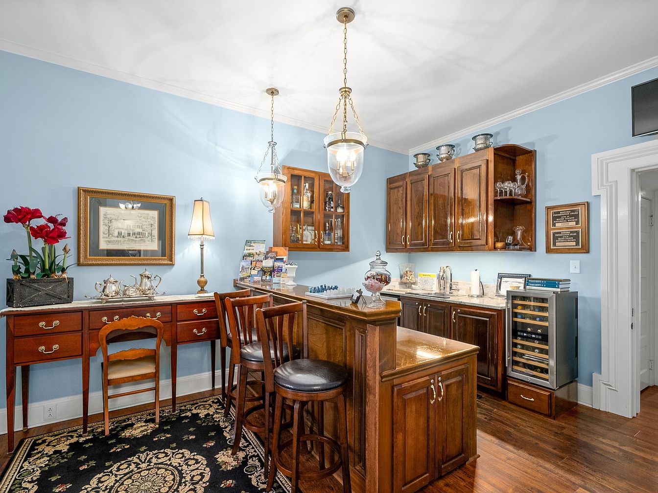 A welcoming home bar area features elegant wood cabinetry paired with a marble countertop, creating a sophisticated yet inviting atmosphere. The light blue walls contrast beautifully with the rich, reddish-brown wood tones of the furniture and bar stools, while pendant lighting adds warmth and charm. The space includes a built-in wine fridge, ample storage for glassware, and a sideboard adorned with a silver tea set and floral arrangement, offering both style and functionality. A plush, patterned rug provides comfort underfoot, and the layout encourages family gatherings or friendly entertainment, making it an ideal spot for relaxation and connection.