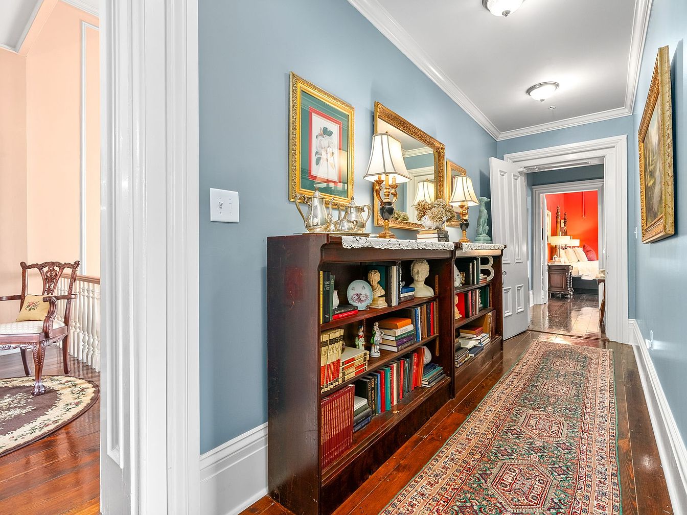 A charming hallway features elegant blue walls offset by crisp white trim and crown molding, creating a tranquil yet refined atmosphere. A long, vintage-style rug anchors the warm wood floors, guiding the eye toward a cozy bedroom beyond. Against one wall, a substantial bookshelf filled with vibrant classics, decorative busts, and cherished heirlooms adds character and invites family reading. Gold-framed art and mirrors, paired with delicate table lamps, lend sophistication and provide inviting light. This nook offers an accessible, family-friendly spot for displaying treasured books and curios, making it both practical and aesthetically pleasing for all ages.