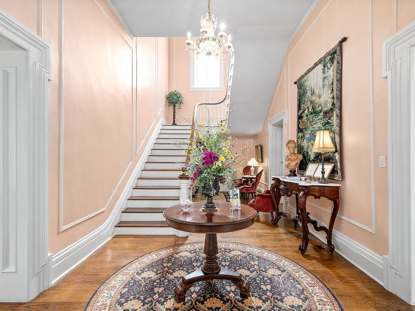 Welcoming entryway features a grand staircase bathed in soft natural light from an upper window, creating a bright and airy ambiance. Elegant peach walls with white trim provide a warm, inviting palette, complemented by gleaming hardwood floors. A circular floral area rug anchors a classic round table adorned with a vibrant bouquet, offering a cheerful focal point. Ornate side tables, vintage lamps, and classical artwork exude timeless sophistication, while spacious walkways and open layout make it perfect for families to gather or greet guests. The overall style balances traditional charm with functional, family-friendly design sensibilities.
