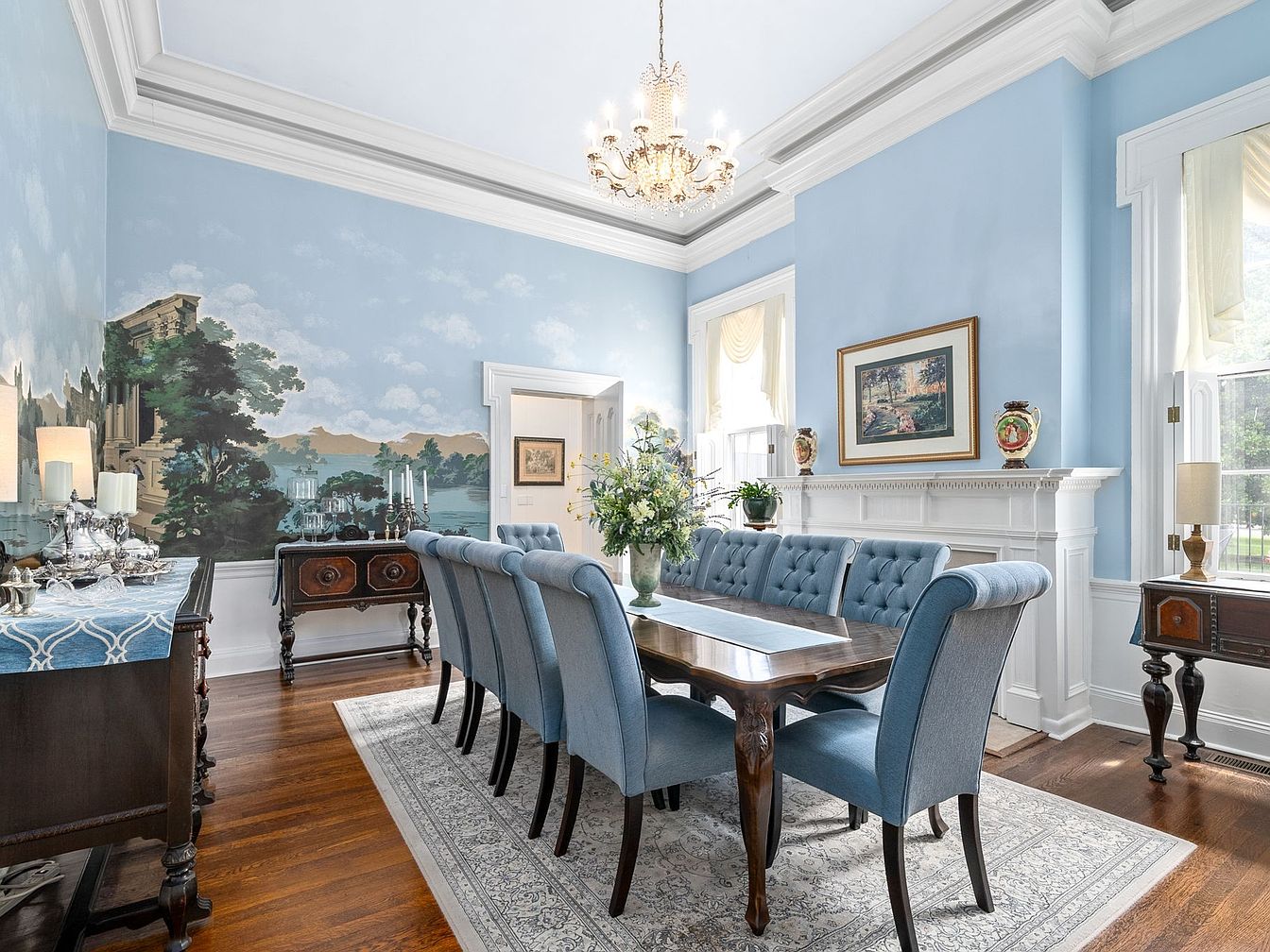 A grand and inviting formal dining room is decorated with soft blue walls and an elegant mural, creating a serene and sophisticated atmosphere. The space features an expansive dark wood dining table surrounded by tufted blue velvet chairs, perfect for large family gatherings or entertaining guests. Crown molding and intricate trim add classic architectural charm, while rich hardwood floors are complemented by a traditional area rug. Ample natural light streams through tall windows dressed in simple cream drapery. Decorative accents like a sparkling chandelier, framed artwork, and ornate sideboards complete the room’s warm, family-friendly appeal.