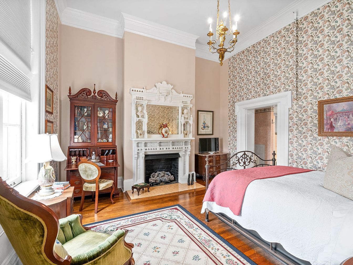A spacious Victorian bedroom showcases high ceilings, intricate crown moldings, and a grand chandelier, evoking a sense of timeless elegance. The decorative fireplace, complete with ornate white trim, becomes a focal point, flanked by a vintage writing desk and a display cabinet holding cherished family heirlooms. Cozy and inviting, the room features a wrought-iron bed layered with crisp white bedding and a red quilt, perfect for family comfort. Warm wooden floors soften underfoot with a floral rug, echoing the delicate wallpaper that lines an accent wall. Soft natural light filters through large windows, creating a peaceful and family-friendly retreat.