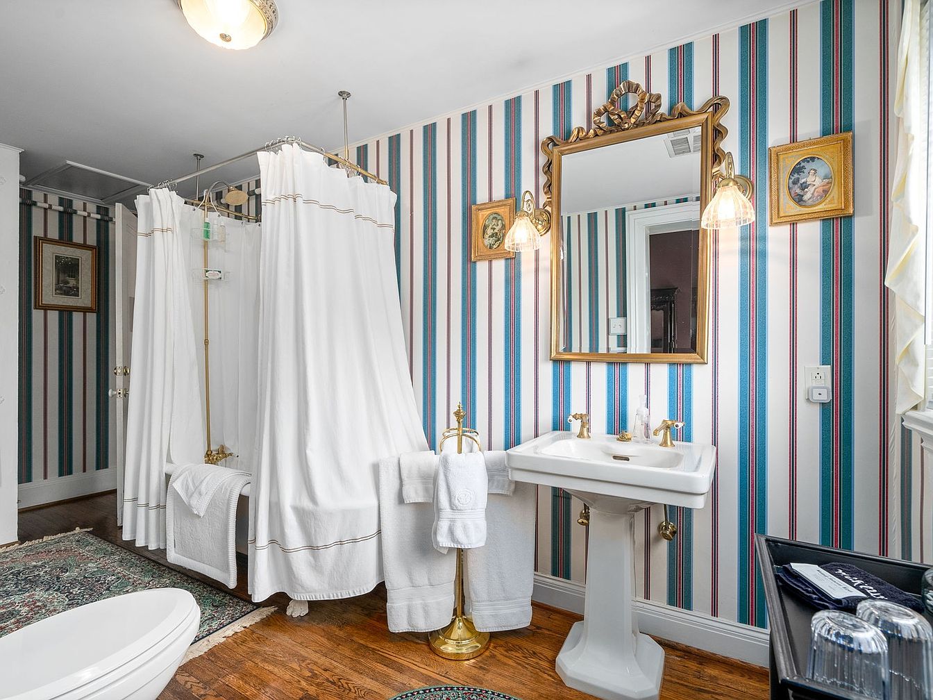A welcoming bathroom with a vintage charm, featuring vibrant vertical striped wallpaper in blues, reds, and whites, creating an inviting and playful atmosphere that’s ideal for families. A clawfoot tub with an elegant shower curtain and brass fixtures stands as the room’s centerpiece. The pedestal sink, paired with gold-toned faucets and ornate mirror, adds a timeless touch. Soft lighting from wall sconces and natural daylight from a window illuminate the space. Hardwood floors lend warmth, while traditional rugs add coziness underfoot. Thoughtful details, such as neatly arranged towels and classic framed artwork, elevate the room’s overall sense of comfort and style.