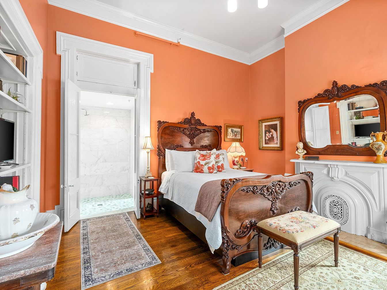 Warm, inviting orange walls set a cheerful tone in this elegant bedroom, where intricate wood-carved furnishings take center stage. A stately bed features floral accent pillows, and a matching bench completes the cozy, traditional look. The vintage charm is boosted by an ornate mirror and classic decor along the white fireplace mantle. Hardwood floors and softly patterned rugs add comfort underfoot, while large white-trimmed doors open seamlessly to a luxurious marble-finished en-suite bathroom, offering modern convenience. Artful lighting and family photographs contribute to a personal, family-friendly touch, creating a space that balances sophistication with everyday comfort.
