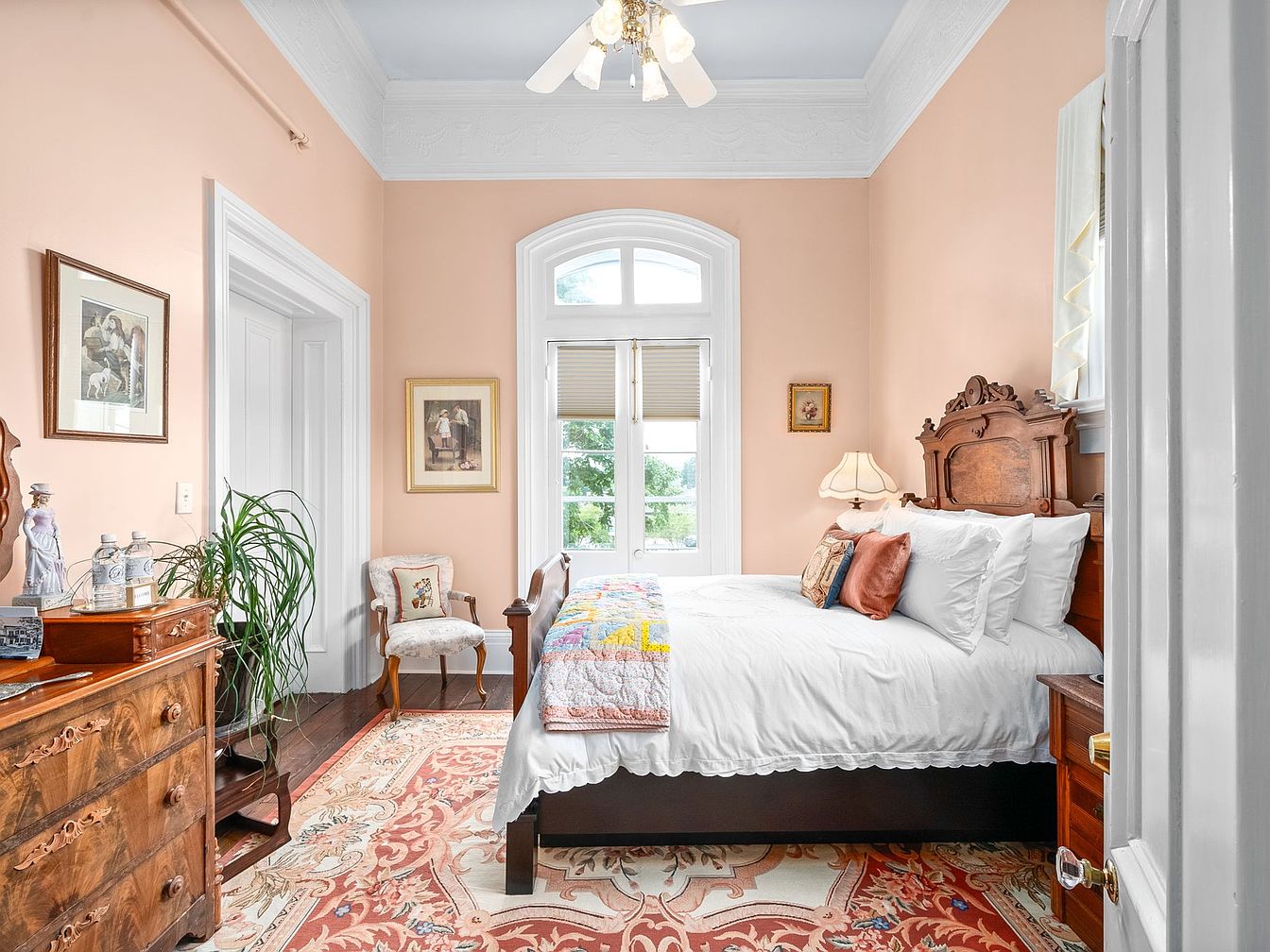 A cozy bedroom exudes classic American charm with its high ceiling, ornate crown molding, and large arched window that fills the room with natural light. The soft peach walls create warmth, while the dark wood bed frame and antique dresser offer a timeless elegance. Carefully selected family-friendly touches, such as a softly upholstered chair and inviting area rug, make the space welcoming for all ages. Framed vintage art and a patchwork quilt add personality and comfort. Balanced symmetry in furniture placement and the graceful ceiling fan complete this tranquil, restful space ideal for relaxing after a busy day.