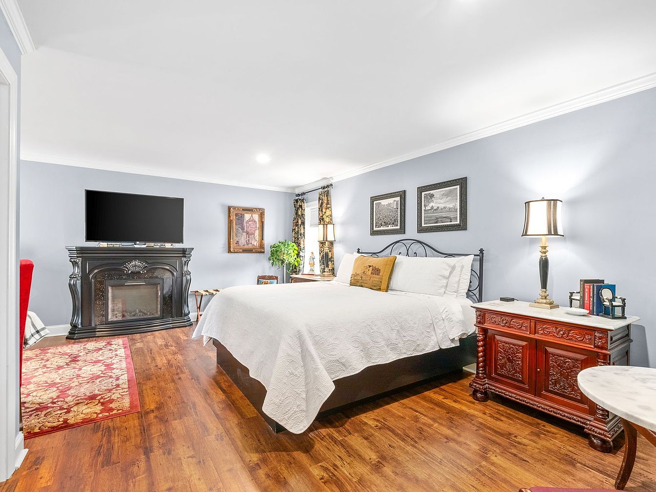 A spacious master bedroom featuring soothing light blue walls paired with rich, warm wood flooring for a welcoming ambiance. The main focal point is a luxurious king-sized bed with crisp white linens and an elegant iron headboard, flanked by classic carved wood nightstands. A detailed fireplace with a mounted TV above adds both comfort and style, while an ornate area rug brings a hint of tradition. Family-friendly touches include easy-to-clean floors, ample lighting, and cozy seating in the corner for bedtime stories. Tasteful artwork and a touch of greenery round out this elegant, relaxing retreat perfect for unwinding.