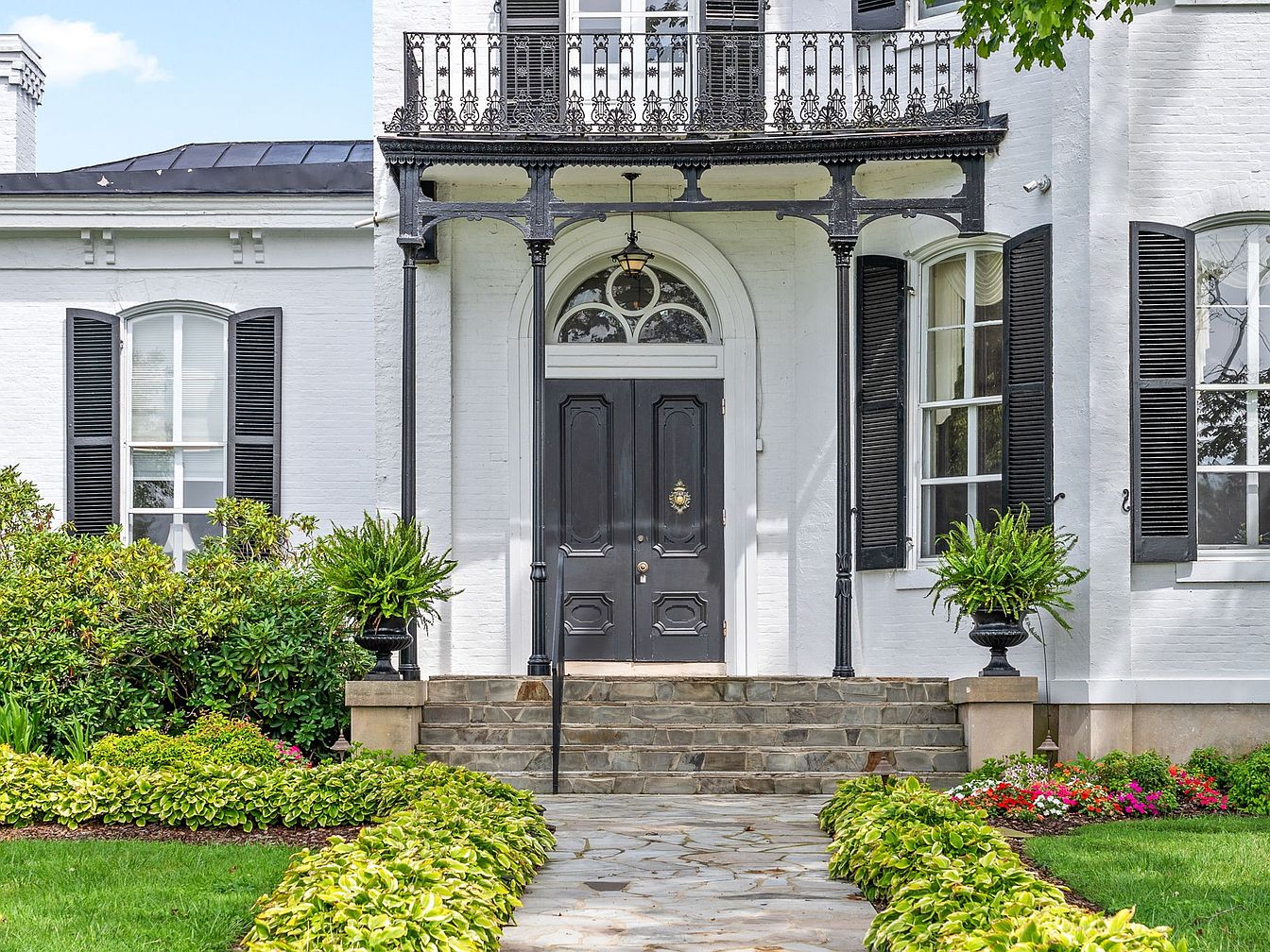 A stately front entryway welcomes visitors with its elegant stone walkway lined by meticulously manicured hedges and lush green plantings. The entrance features a bold black door with intricate brass accents, framed by tall, arched windows detailed with classic black shutters. Decorative wrought ironwork graces both the upstairs balcony and the columns supporting the covered porch, lending architectural distinction. The crisp white brick façade enhances timeless curb appeal, while large potted ferns add a touch of natural freshness. The spacious layout and inviting steps make this an ideal family-friendly introduction to a sophisticated, traditional American home.