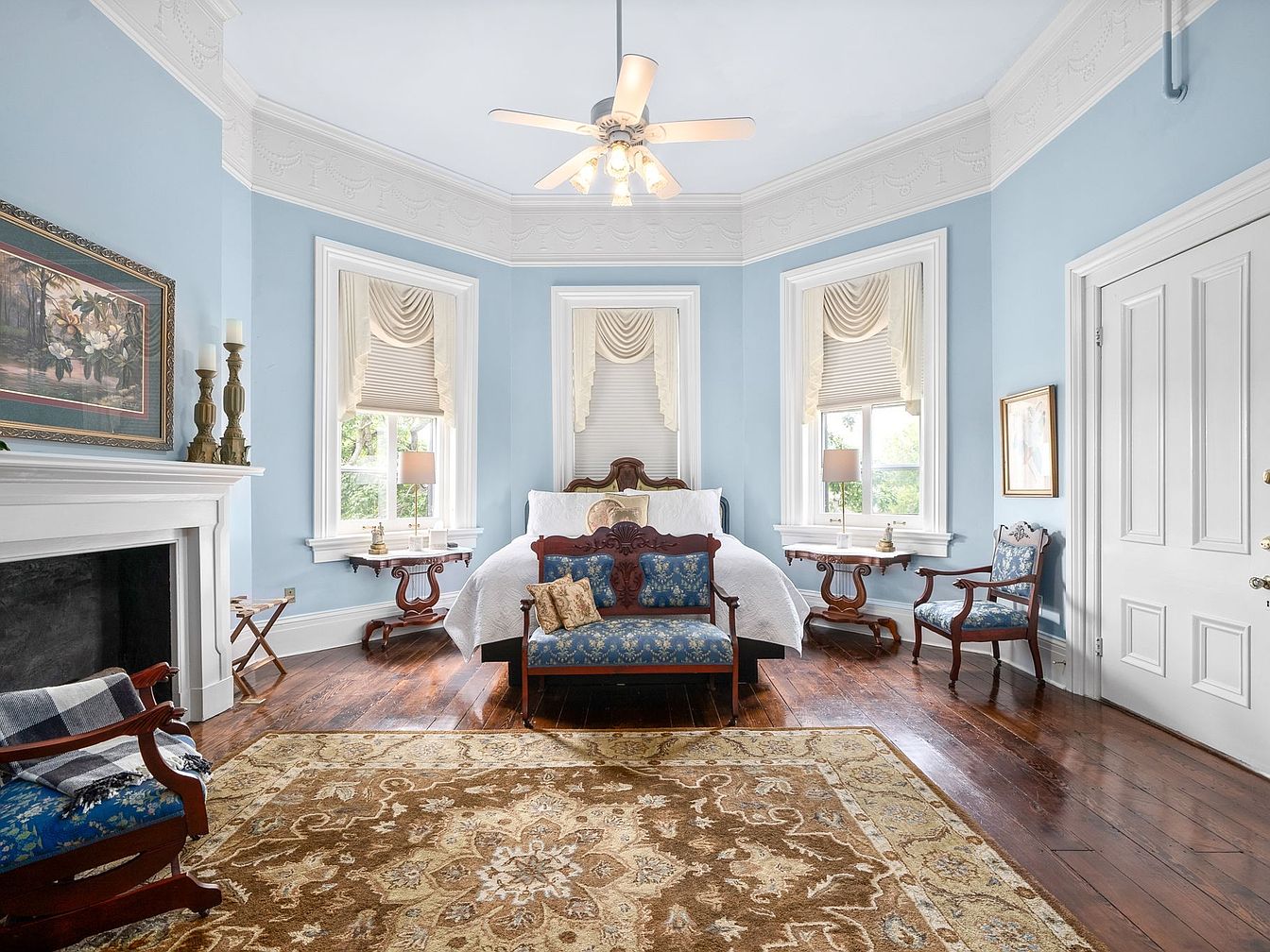 A spacious, light-filled bedroom features powder blue walls and crisp white trim that complement the tall, intricate ceilings adorned with elegant crown molding. Wide-plank, gleaming hardwood floors offer warmth and sophistication beneath a richly textured vintage area rug. The traditional wooden bed is set against three tall, symmetrical windows dressed in creamy drapes, flooding the room with natural light. Ornate dark wood furniture, including armchairs with blue patterned upholstery, a cozy loveseat at the foot of the bed, and an antique fireplace, amplify the inviting family atmosphere. Carefully selected decor and plush bedding create a tranquil, welcoming retreat.