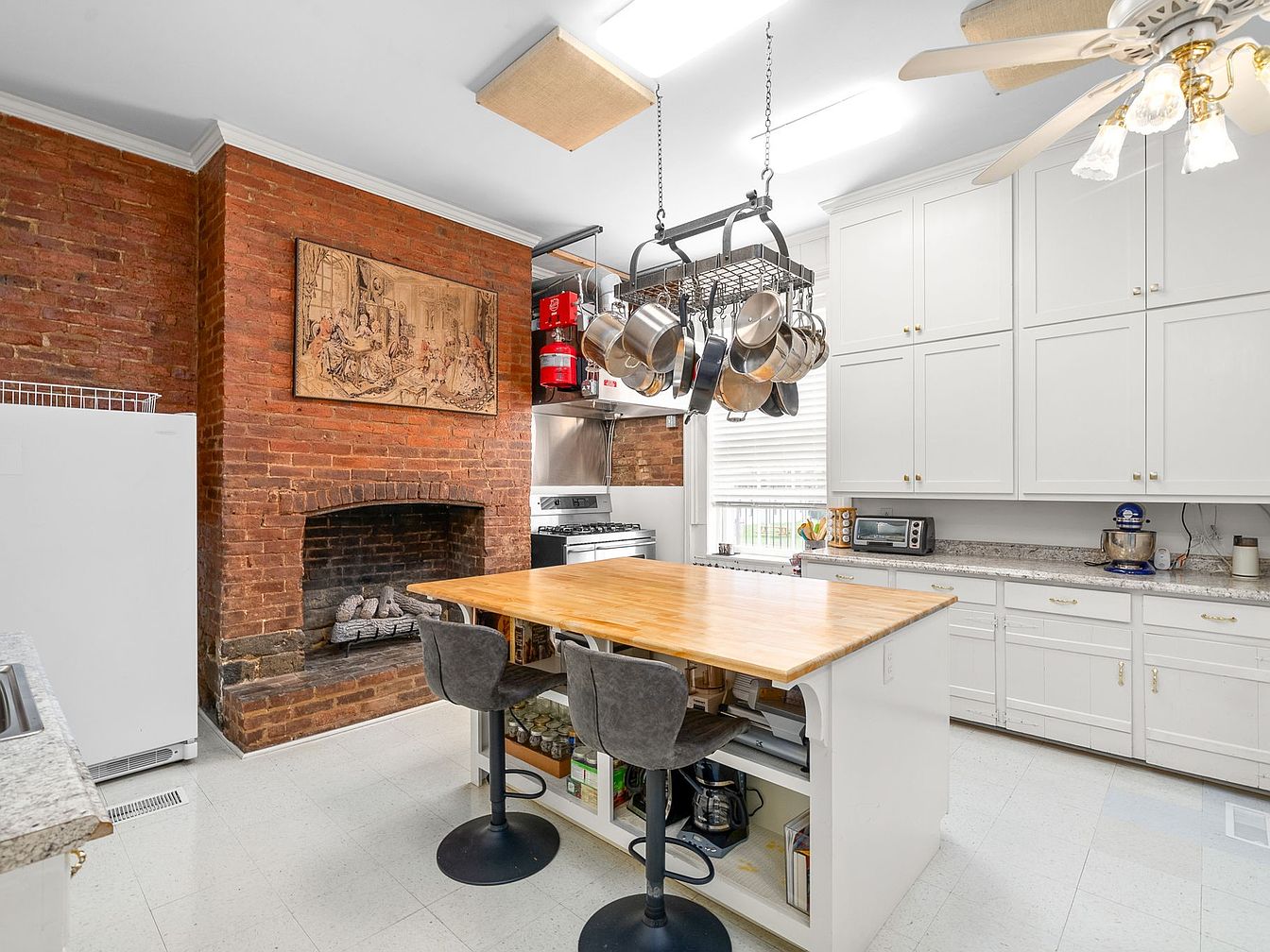A bright and inviting kitchen blends modern updates with classic charm, featuring a large wooden island perfect for family gatherings, meal prep, or casual seating. Crisp white cabinetry and granite countertops offer ample storage and work space, while stainless steel kitchen appliances keep things functional for everyday use. An exposed brick wall and fireplace evoke a cozy, historical feel, enhanced by a hanging tapestry. Pots and pans are conveniently stored above the island, adding to the easy, practical flow for family cooking sessions. The space is bathed in natural light, making it a true heart of the home.