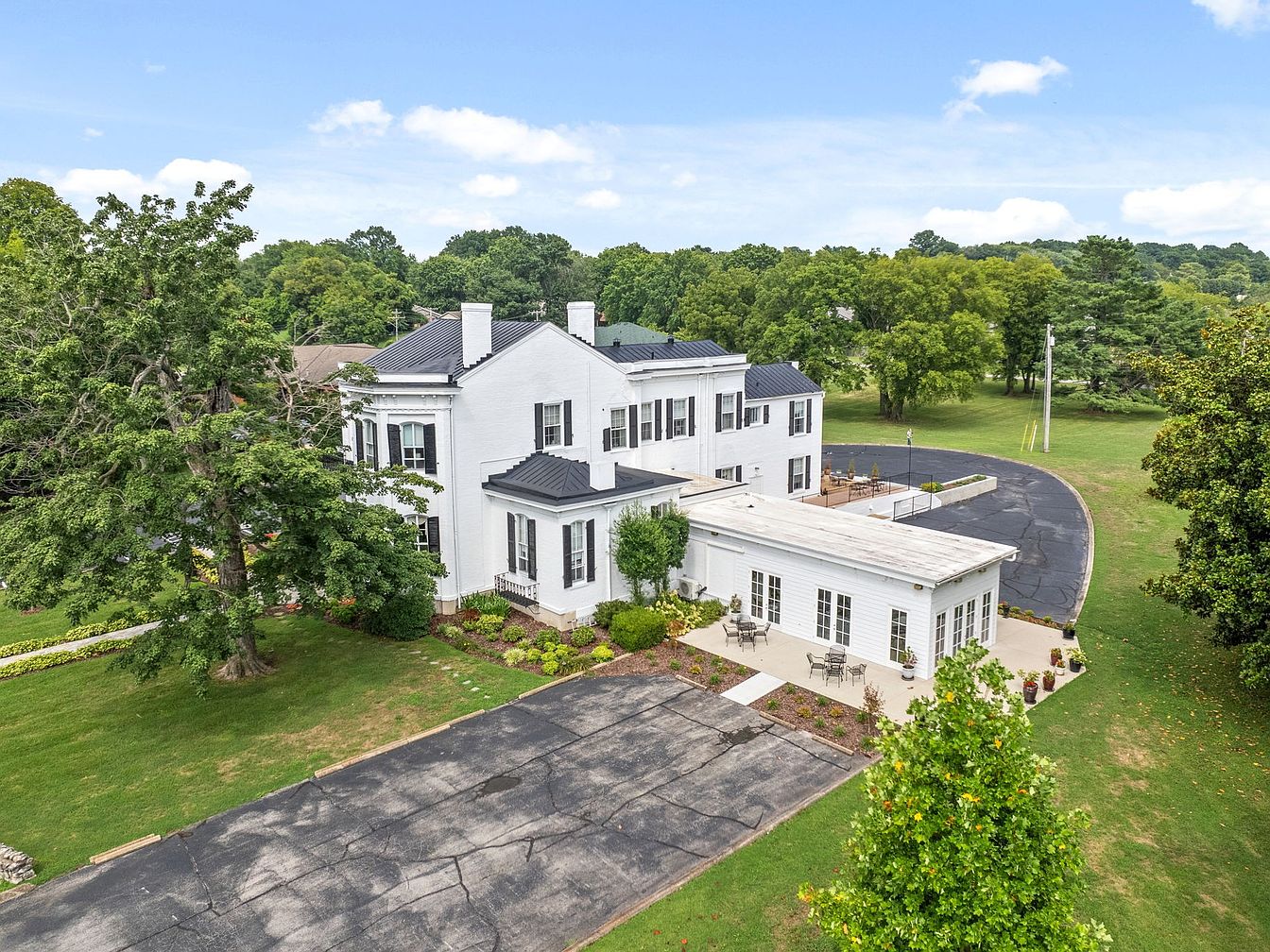 A stately American home with classic white brick exterior, offering an inviting front entry surrounded by lush green lawns and mature trees. The black metal roof accents and elegant window shutters enhance its timeless appeal. Ample driveway space provides convenience for family vehicles and guest parking. The landscaped gardens are neatly bordered with shrubs and mulch beds, adding a touch of warmth to the formal look. Multiple outdoor seating areas along the patio extend entertaining possibilities, making it ideal for gatherings and playtime. Abundant natural light streams through large windows, promising bright and airy interiors well-suited for family living.