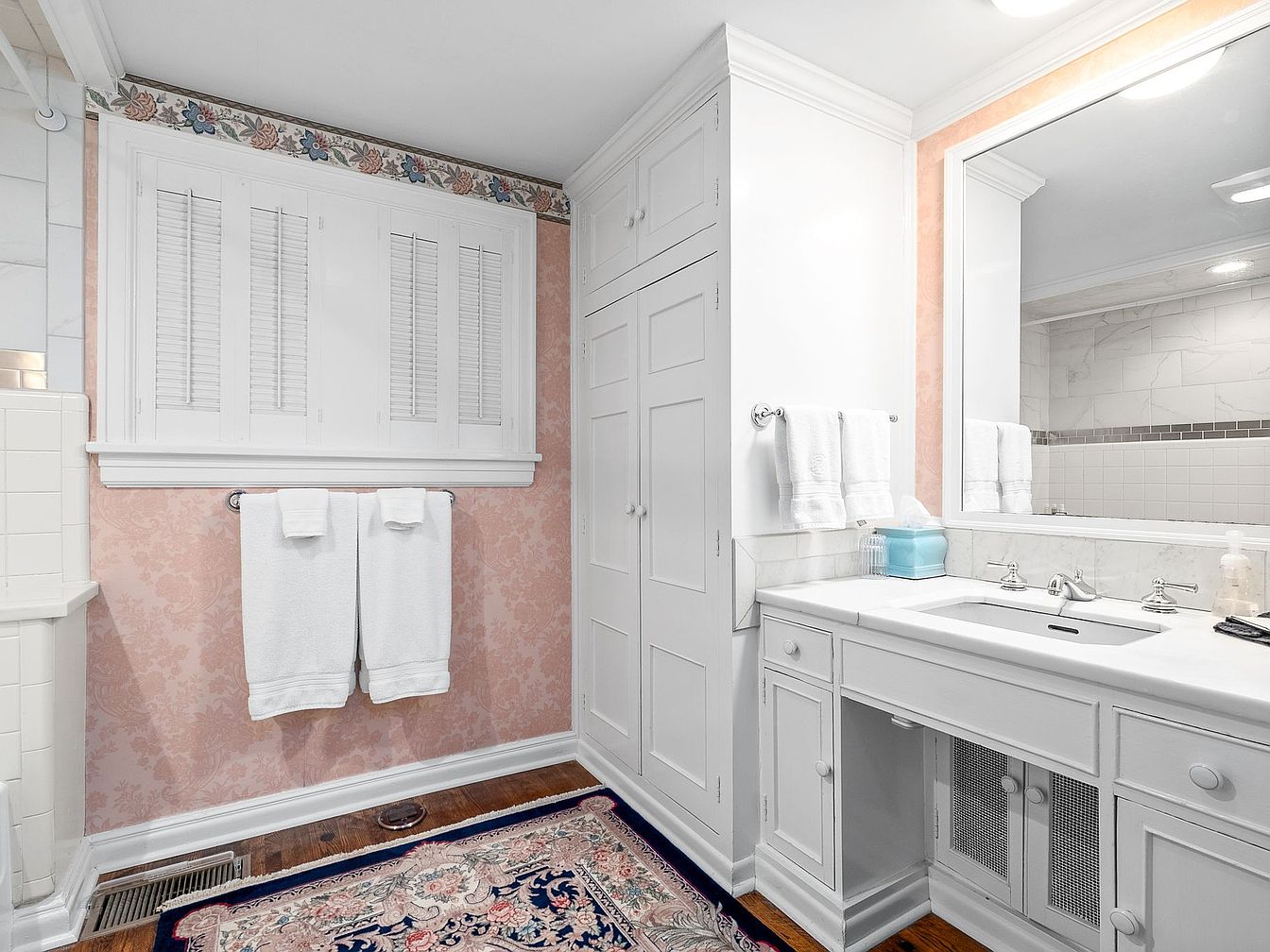 A bright and inviting bathroom vanity area highlighted by crisp white cabinetry and moldings, lending a fresh, classic ambiance to the space. The soft pink damask wallpaper is complemented by an elegant floral border, adding warmth and charm. Ample storage is provided by built-in cabinets and a spacious vanity with a large mirror, while polished chrome fixtures deliver a sense of timelessness. Family-friendly touches include double towel racks and a plush area rug for comfort and safety. The neutral color palette with subtle blue and blush accents makes this bathroom feel both relaxing and sophisticated—perfect for daily routines.