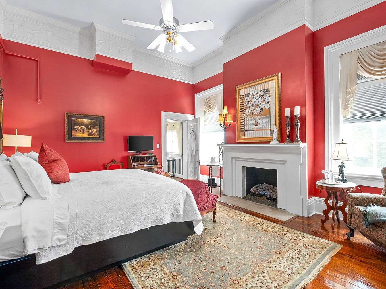 A spacious bedroom exudes warmth and sophistication with its bold red walls and intricate white molding lining the high ceilings. The centrally placed white fireplace, adorned with decorative candlesticks and framed art, acts as a striking focal point. Rich wood floors provide a gleaming foundation, partially covered by a traditional patterned area rug. Comfort is paramount with a plush bed dressed in crisp white linens and accent pillows. Large windows invite natural light, softened by elegant drapery. Family-friendly features include ample seating, abundant space for movement, and a calm, inviting ambiance perfect for relaxing or gathering.