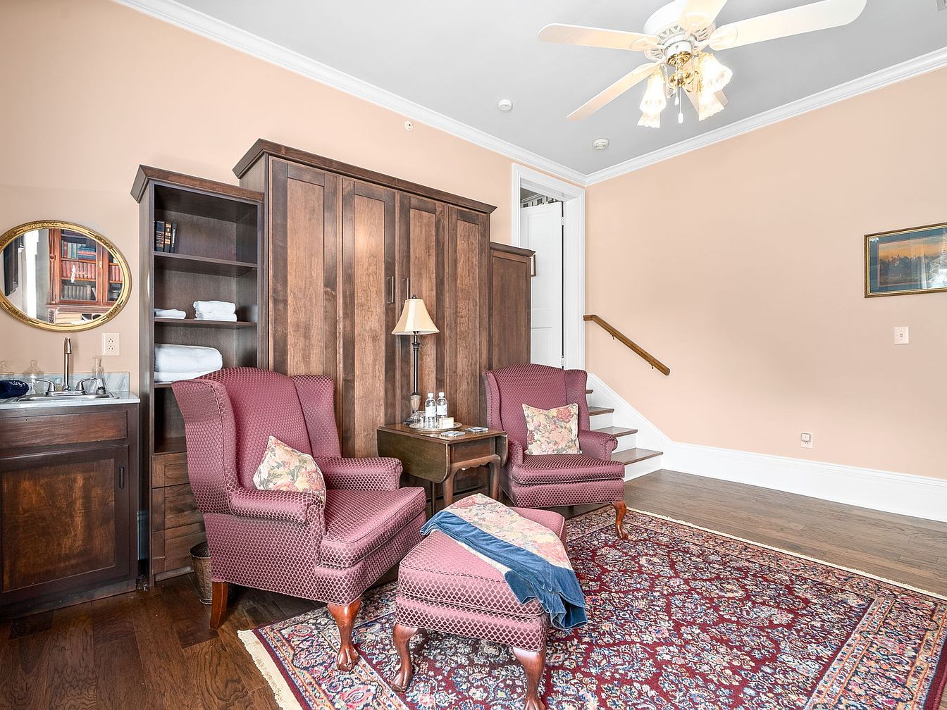 A cozy sitting area welcomes with two plush burgundy armchairs and a matching ottoman, set atop an ornate Persian rug that anchors the space. Warm wooden cabinetry and shelving provide both storage and classic sophistication, while soft peach walls and crisp white trim brighten the room. A small wet bar with a circular gold-framed mirror adds convenience for family gatherings or casual entertaining. Decorative accents, such as patterned throw pillows and a slender table lamp, lend charm and comfort. A nearby staircase suggests easy access to other levels, making this nook perfect for reading, conversation, or relaxing with loved ones.
