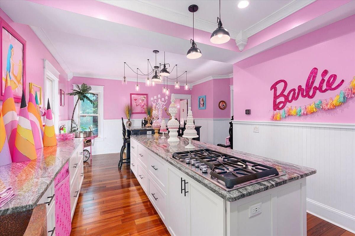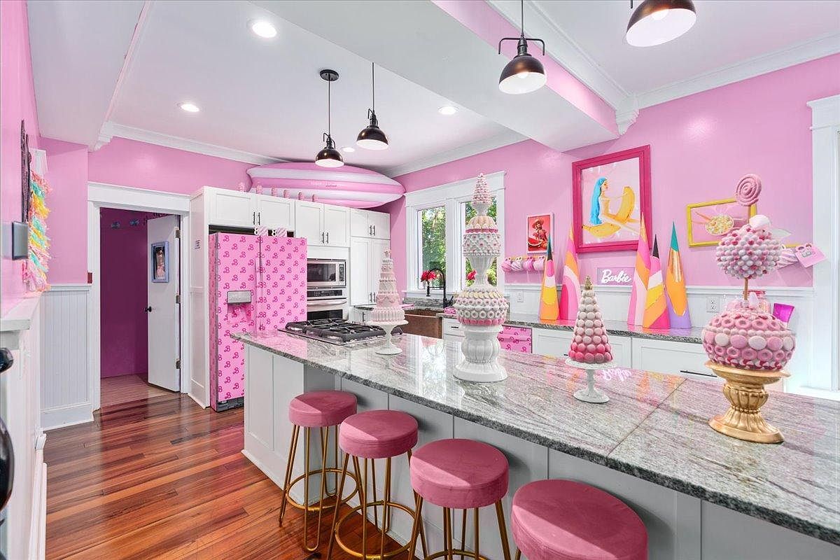This enchanting kitchen radiates a playful charm, dominated by a lively pink color scheme that creates an inviting atmosphere. Sleek white cabinetry contrasts beautifully with the vibrant walls and appliances, enhancing the cheerful vibe. The spacious island features a polished granite countertop, perfect for family gatherings or culinary adventures. Stylish pink velvet stools provide comfortable seating, while playful decorative accents, such as whimsical cake sculptures and colorful artwork, add personality to the space. Ample natural light streams through the windows, enriching the cheerful ambiance, making this kitchen not only functional but an inspiring centerpiece for family interactions.