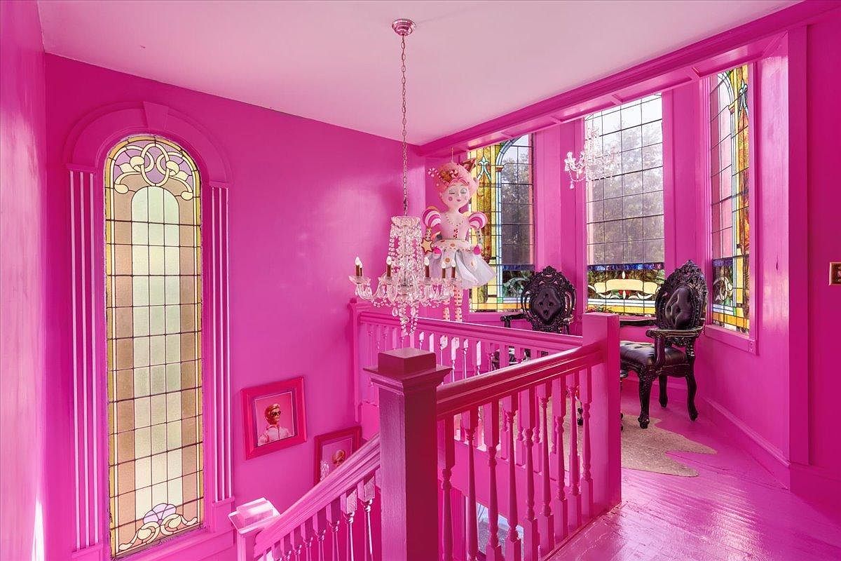 This striking staircase showcases a bold pink palette that exudes playful elegance. The walls are adorned in vibrant pink paint, complemented by the intricate, colorful stained glass windows that invite natural light, creating a warm and inviting atmosphere. A chandelier hangs delicately from the ceiling, enhancing the whimsical aesthetic. The ornate black chairs add a touch of sophistication, while artwork displayed along the walls provides personal charm. The staircase’s wooden railing, painted to match the walls, leads to an upper level, making the space functional and visually engaging—an ideal family-friendly feature that merges creativity with comfort.
